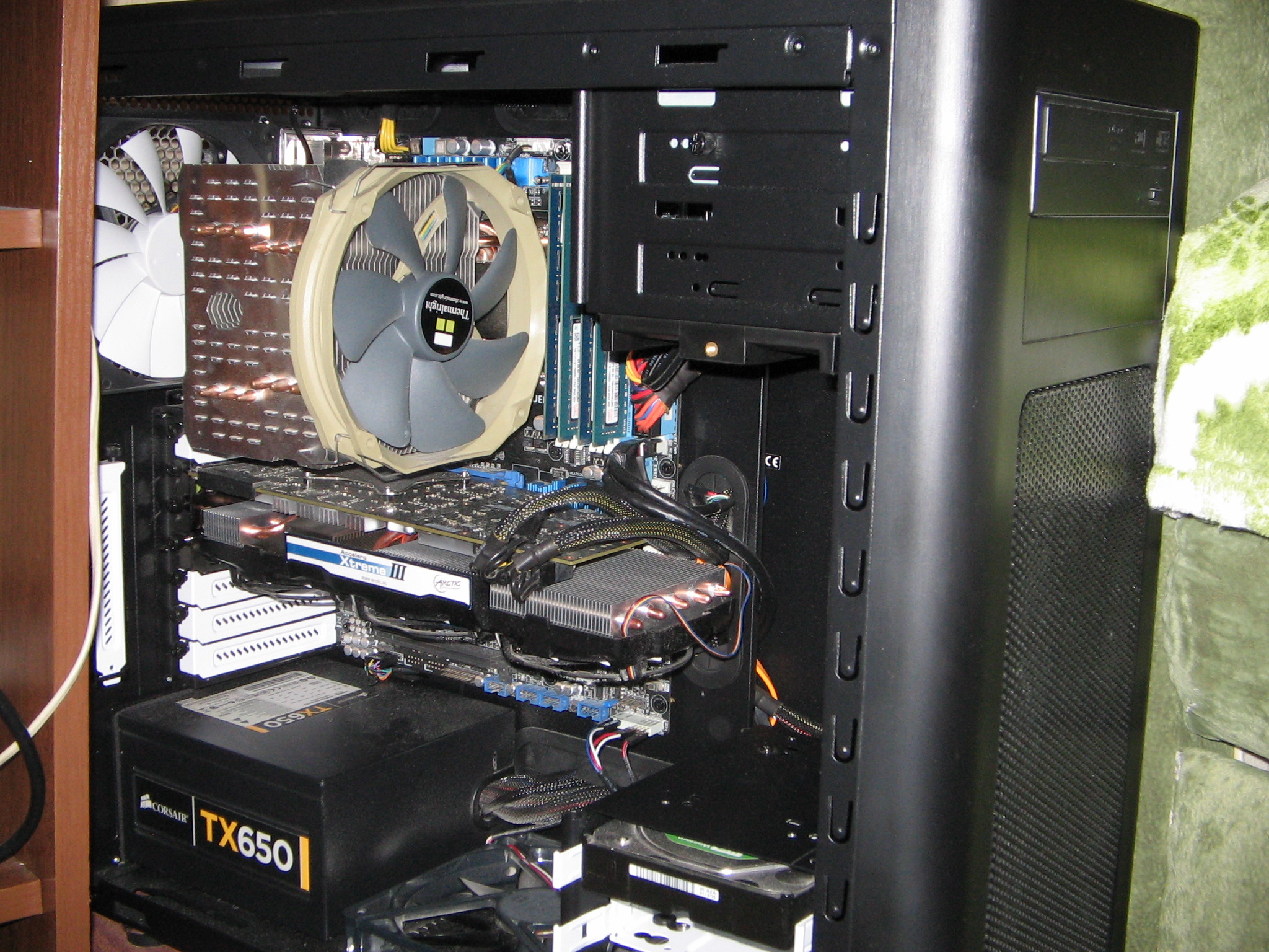 Решил и я свою скромную машинку запостить. Пока без корпуса, в старый вся требуха не лезет, да и на воздухе попрохладнее летом) Конфиг: Core i7 2600K (разгон до 4,4Ггц), мать AsRock Fatality на P67 чипсете, 4 планки по 4 Гб Patriot Viper Extreme, видюхи - MSI GTX 580 и пара MSI R9 280X, питальник Thermaltake 1050W, интеловский ссд 510 серия на 120 гигов и крохотный 80Гб винт из старой PS3). ППД в районе 200к. Пару лет назад конфиг под игрушки собирался, да вот как-то отошел от них.. Добавил пару радеонов и заставил грызть гранит для науки P.S. Кручу фолдинг еще на буке и иногда халявные виртуальные сервера в азуре поднимаю