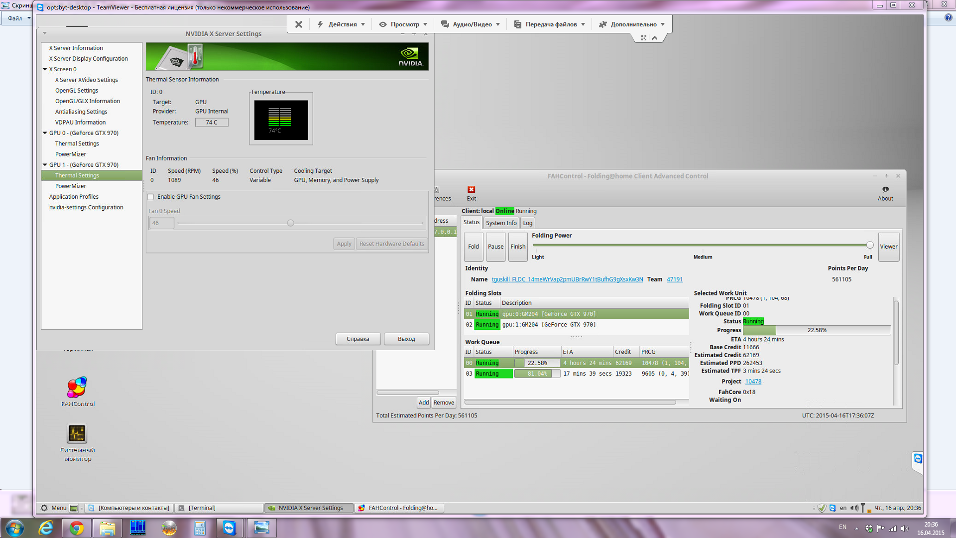 Советую при добавлении клиента в поле Client Name название писать в виде конфигурации: EVGA GTX980 1404 1.225v 346.96 FAHClient V7.4.4 -advanced Ubuntu 14.04.2 LTS x64 спецсимволы здесь недопустимы Потом статистику смотреть можно в Tools\Benchmarks Viewer и оттуда копировать сведения о конфигурации и PPD, значений о шаге задания нужно всего два: Min. Time и Avg. Time А в Tools\Work Unit History можно взять Run, Clock и Gen в последней строчке или в "*", это модификации задания, но если лень открывать и вписывать руками, то можно и не вписывать, достаточно будет просто названия задания