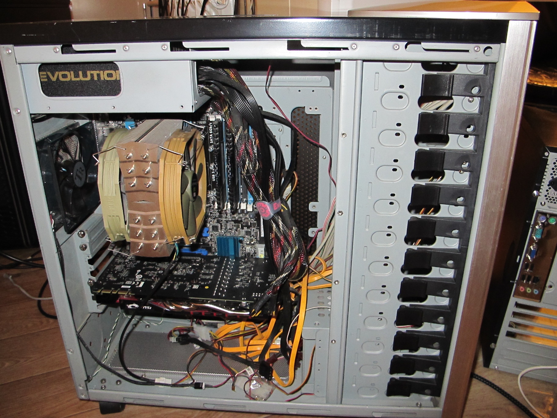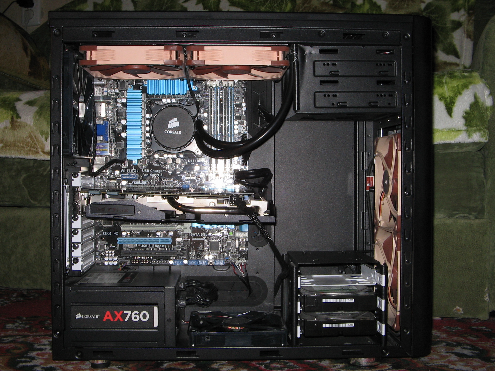 Давненько уже подумываю о воде. Корпус как раз заточен под установку 2x240 либо 1x240 и 1x360 (если убрать 5,25 отсеки). Вперёд можно и 280, от H110 влезает, но пришлось переставить под крышу, т.к. винты грелись. Плохо он продувается на 700 об/мин.