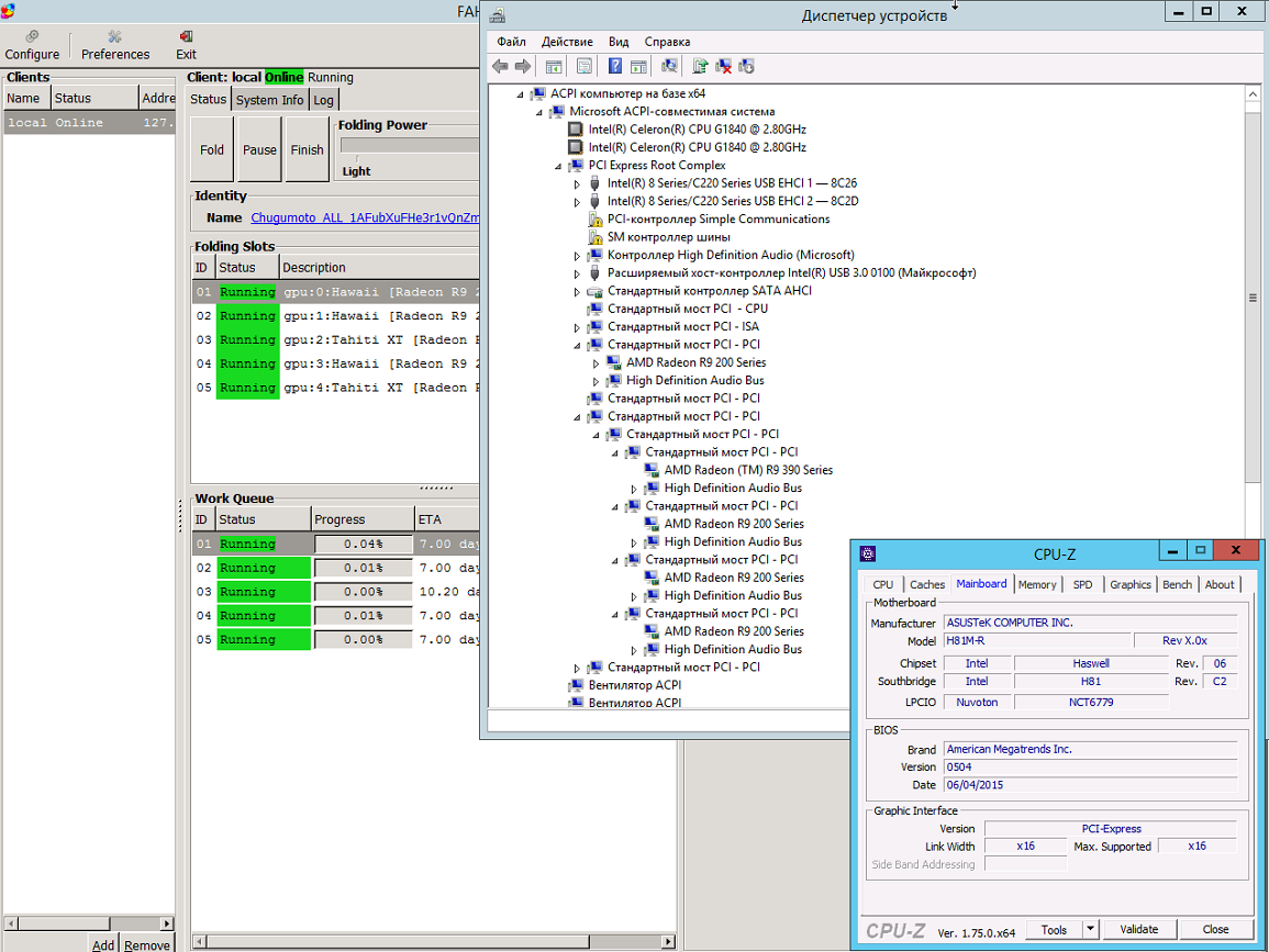 ASUS H81M-R. в наличии 1 х16 и 1 х1 как видишь подключено 5 карт. 4 штуки, что через Sintech ST-PCE4PCE они как? "по одному проводу" или нет? а в том варианте все намного более интересно и с большей пропускной способностью, чем у меня...