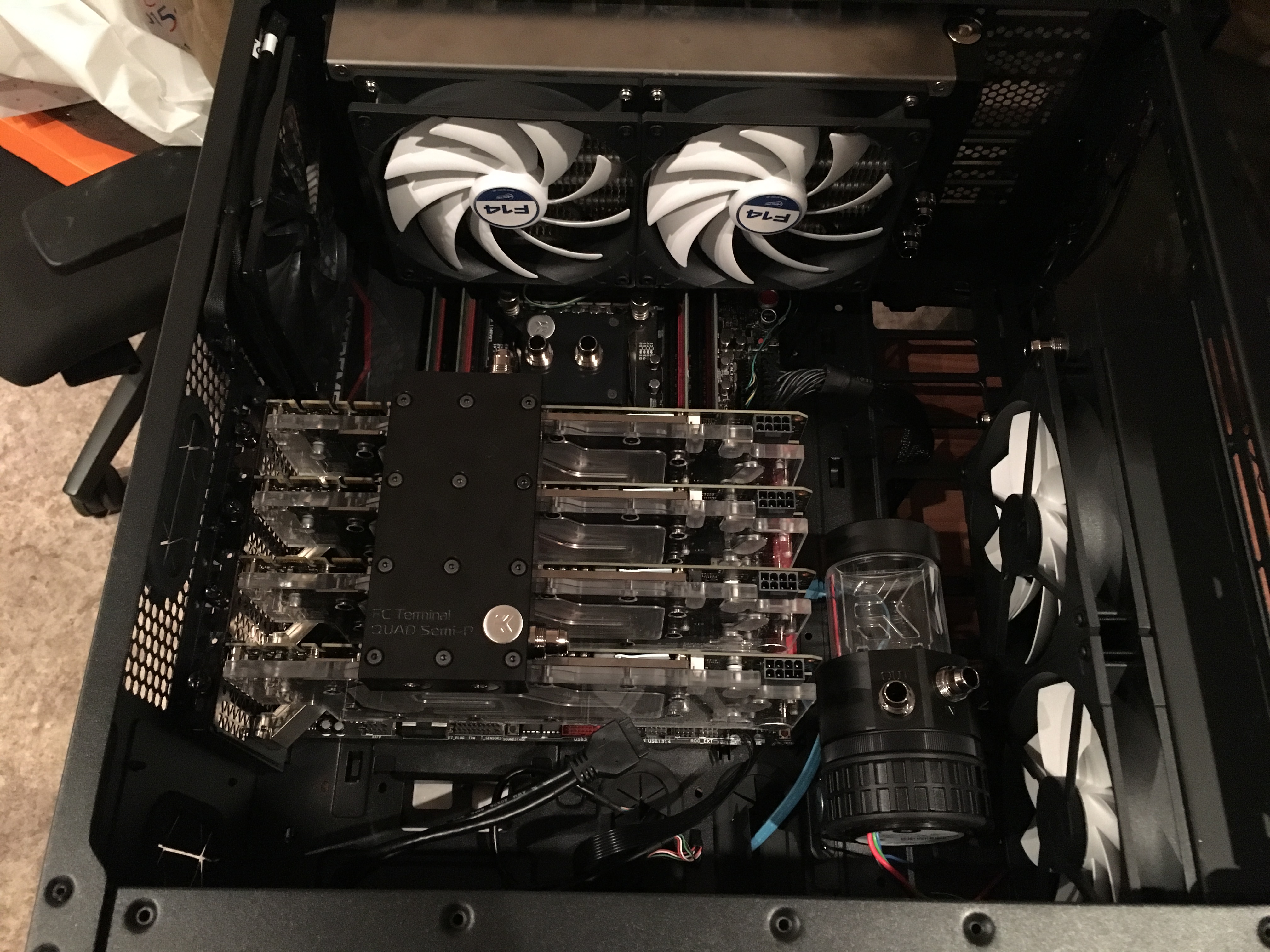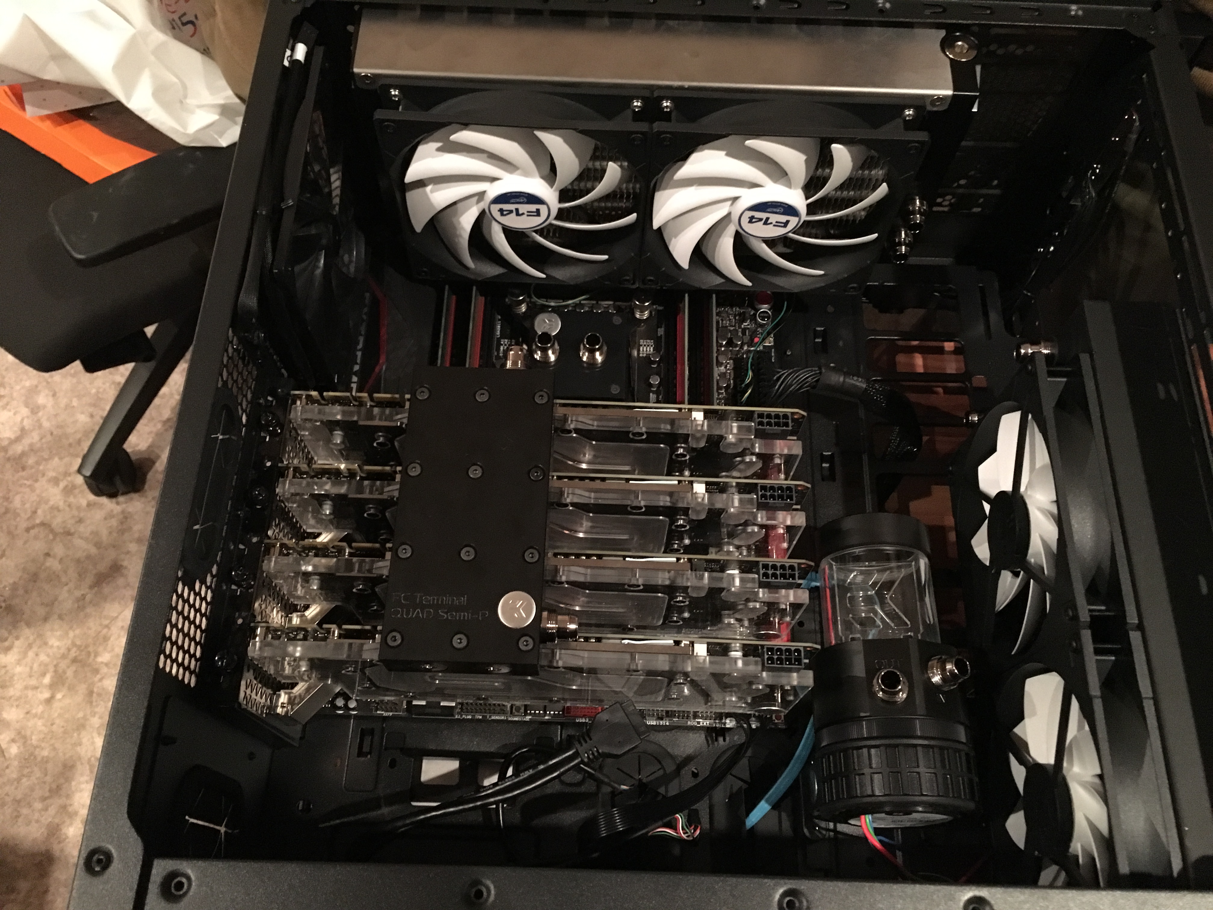 Итак, вести с полей. Последние две недели не прошли даром. Мы осуществили три попытки по сборке системы. Благодаря бескорыстной помощи Zebralet и anwjl на сегодня ситуация такая: Материнка с одетым водоблоком на камень стоит в корпусе. Также в корпус встали два радиатора и помпа с водоблоком. В материнку вкрячены 4 видеокарты с водоблоками, объединенные мостом. При этом обнаружилась некая странность. Все 4 видеокарты не защелкнули защелки на разъемах PCI-E, пришлось их защелкивать отверткой. Zebralet сказал, что это ему дюже не нравится. Но все равно будем пробовать.