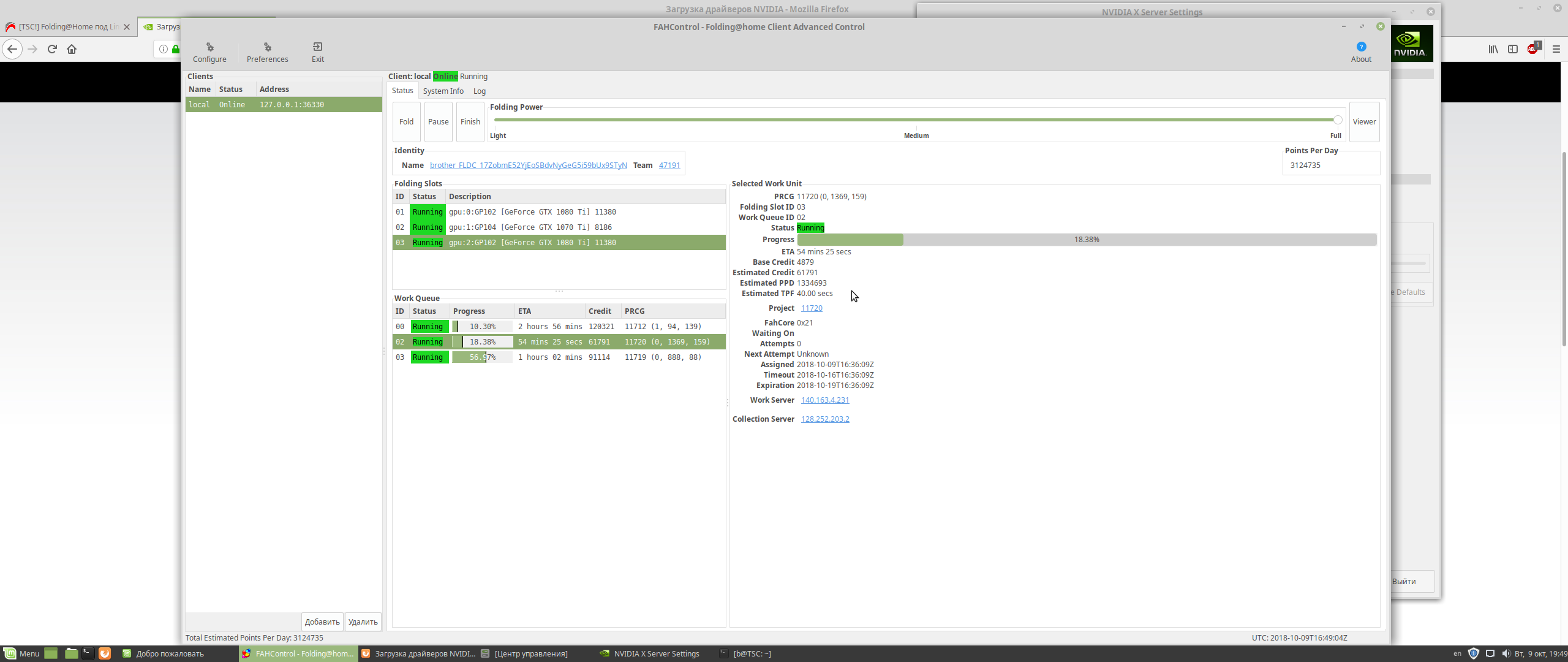 Итак, как я уже писал ранее появились сообщения, что на Linux новые дрова увеличивают ppd на 1080ti процентов на 5. Наконец-то появилось время проверить. Поскольку с линём я на Вы просто переставить дрова не удалось, так как не запускалась консоль почему-то. Разбираться было лень, решил просто всё переставить, вроде недолго... Наивный Итак, результаты: 1. Ставить новую версию Mint пока не стоит. Лайв 18.3 не завелся с картой Nvidia. Множественные ошибки nouveau при запуске. Пришлось остаться на Mint 18.2. 2. Шаманская команда для включения разгона на всех картах в системе с несколькими видяхами работает. Как я уже писал ранее, в полученный xorg.conf остается включить ссылки на edid.bin для работы без моника.