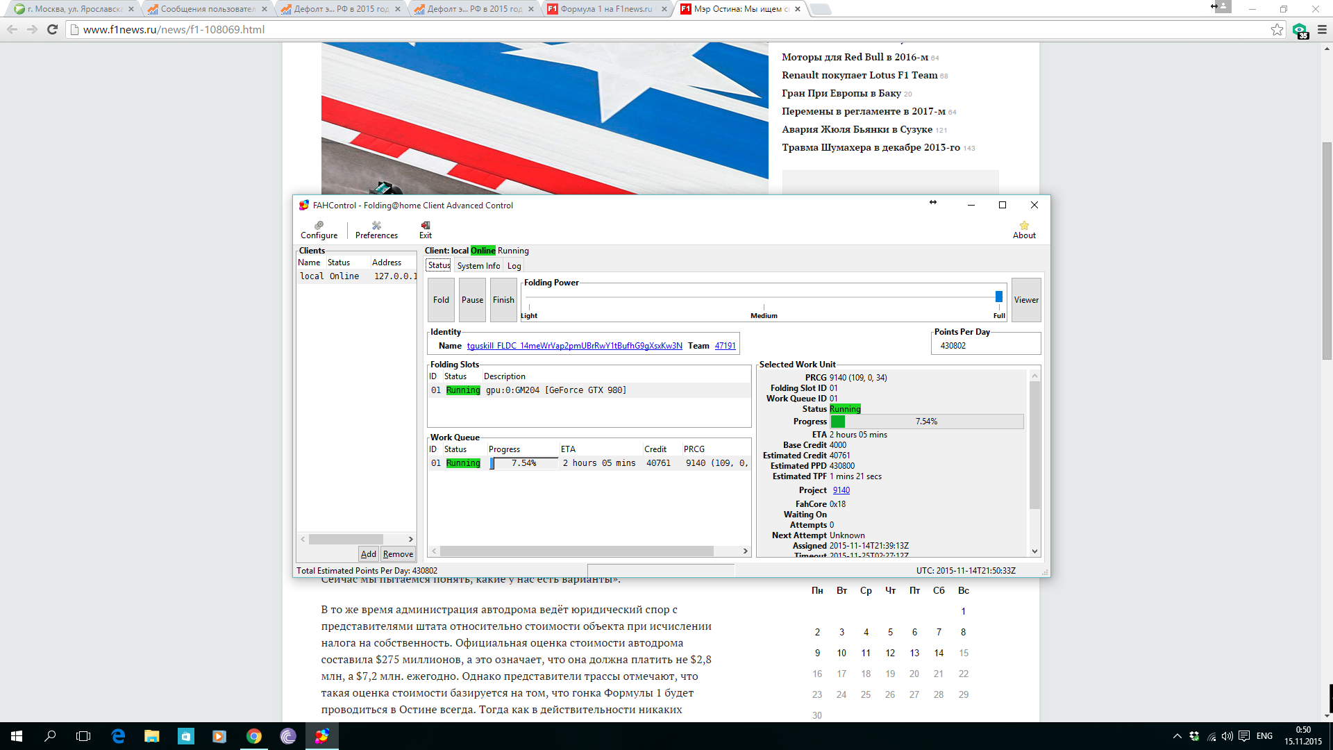 Советую при добавлении клиента в поле Client Name название писать в виде конфигурации: EVGA GTX980 1404 1.225v 346.96 FAHClient V7.4.4 -advanced Ubuntu 14.04.2 LTS x64 спецсимволы здесь недопустимы Потом статистику смотреть можно в Tools\Benchmarks Viewer и оттуда копировать сведения о конфигурации и PPD, значений о шаге задания нужно всего два: Min. Time и Avg. Time А в Tools\Work Unit History можно взять Run, Clock и Gen в последней строчке или в "*", это модификации задания, но если лень открывать и вписывать руками, то можно и не вписывать, достаточно будет просто названия задания