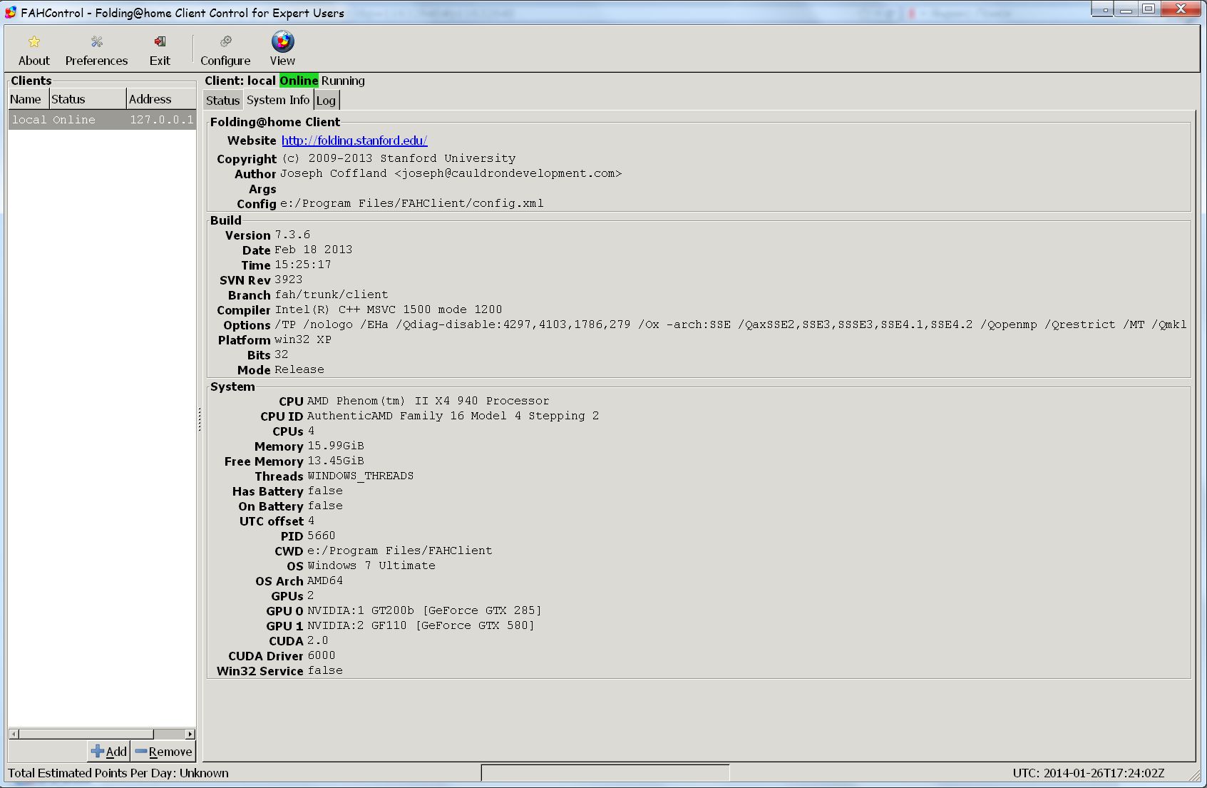 Мои параметры для двух видеокарт: Дисплей подключен к GTX285, счёт на GTX580. В первом слоте GTX580 (я не мог её поставить вниз из-за шлангов с водой). В настройках GUI клиента: gpu-index 1; opencl-index 0; cuda-index 0. Перед всеми сменами этих значений я делал остановку фолдинга в клиенте. Куда он пишет эти значения, я не понял. Не в config.xml - это точно. В настройках установки программы я указывал "установить для всех пользователей", расситывая, что настройки будут в папке программы. И больше у меня нет нигде config.xml, кроме папки программы.