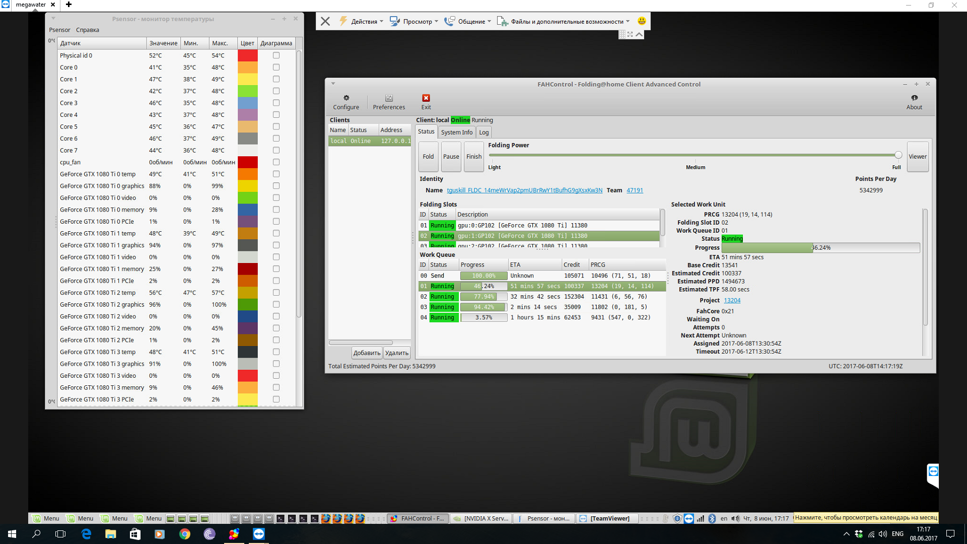 В итоге получилось как-то вот так. Карты пока разогнаны на 115 МГц. Максимальный ппд на 13204 - 1 550 000 Сегодня в Москве было около 25 градусов, карты нагрелись до 60. При удачном стечении обстоятельств Кранчзилла может выдать около 6М в сутки. Фотодоказательство прилагаю