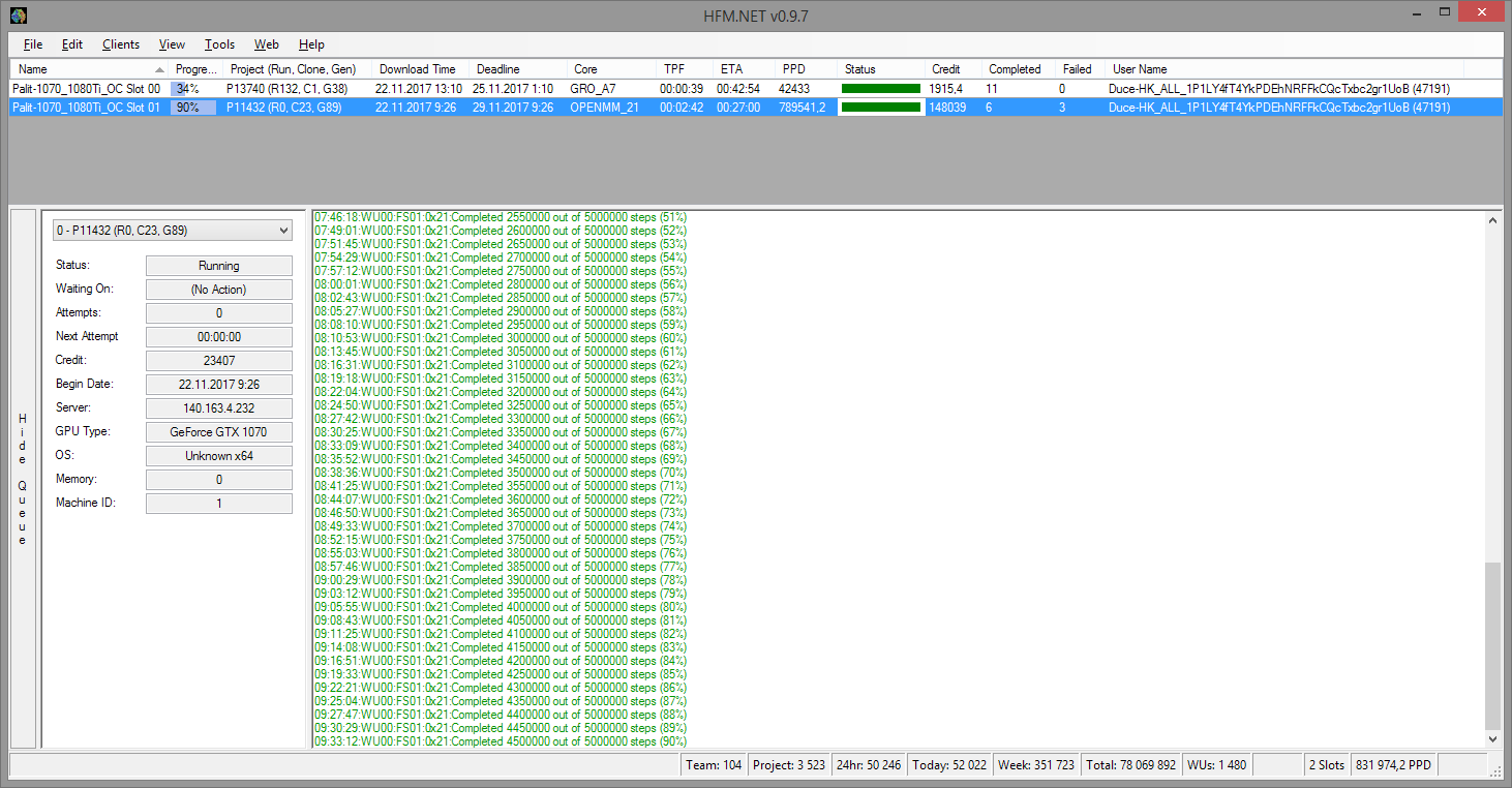 Примеры заполнения конфигураций в FahSpy и HFM.NET: Intel Core i7-5930K 3.7Ghz 4.0GHz 2x1 GB DDR3-1800 MHz Win7 SP1 x86 v6.34 -smp 10 Intel Core i7-5930K 3.7Ghz GTX980Ti 1500 1.231v Win10 x64 358.91 WHQL v7.4.4 -beta - Если на компьютере одновременно работает несколько клиентов, то обязательно писать итог - Если счет идет только на видеокарте, то модель процессора можно не писать