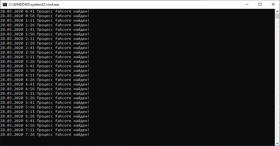 @echo off chcp 1251 >nul set ln=Процесс fahcore найден! chcp 866 >nul :loop cd %appdata%\FAHClient\ tasklist /fi "imagename eq fahcore_21.exe" | find /i "fahcore_21.exe" > nul if not errorlevel 1 set res=true tasklist /fi "imagename eq fahcore_22.exe" | find /i "fahcore_22.exe" > nul if not errorlevel 1 set res=true if defined res ( Echo %date% %time:~0,2%:%time:~3,2% %ln% ) else ( taskkill /f /im "FAHClient.exe" & start "" "%PROGRAMFILES(x86)%\FAHClient\FAHClient.exe" ) timeout 900 Goto :loop