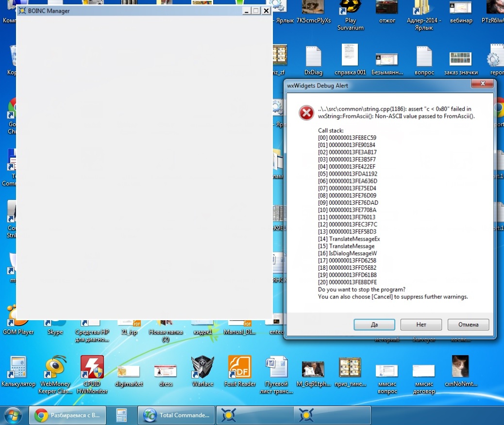 belskiy Если ставить последнюю версию на чистую винду с обновлениями то ошибки нет. У брата на ноуте поставил последнюю версию после ошибочной версии, так сперва эта ошибка была, а сегодня запускаю у него boinc и ошибки уже нет - чертовщина какая то. Короче все работает нормально если ставить последнюю версию 7.4.36 на чистую винду. Писал на форум боинк, мне там разраб предложил какие то танцы с бубном, что-то про логи и тд, пробывал по его инструкции - но у меня ничего не вышло. Проблема связанная со славянскими языками я так понял, чешским, греческим и кирилицей. http://boinc.berkeley.edu/dev/forum_thread.php?id=9834 Вот может, кто разберется. п.с. Если успеть нажать "Отмена" то программа не закроется.
