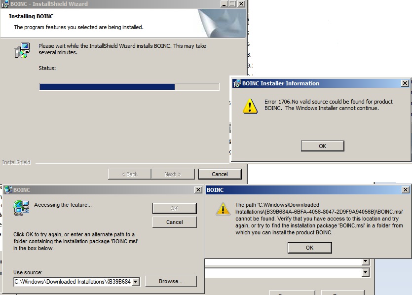 Всем привет! Перестал у меня считать один проект на боинке, на их сайте сказали надо переустановить боинк ну а так как у меня какая то древняя версия стояла то подумал что наверное пора обновить, но инсталятор старую версию удалил а новую не ставит, пишет отсутствует файл Boinc.msi, пытался его выбрать вручную в папке где он распаковывался но выскакивали аналогичные ошибки. Братцы что делать?