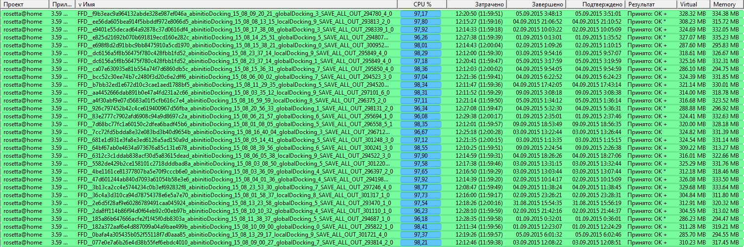 Тогда ничего не понимаю. Ладно бы на одной машине у меня такое было. Но на шести минимум (еще две машинки сейчас не могу лично проверить)? Еще не понял: вот задание http://boinc.bakerlab.org/rosetta/result.php?resultid=756859009 Расчет начат в 21.31, завершен в 23.29. Т.е. почти 2 часа, или почти 7200 секунд. 1 starting structures 1243.67 cpu seconds. Начался расчет на 6 стурктуре, закончился на 10-й. Почему 1200 секунд? Клиент 7.0.64. При этом на некоторых машинках вроде нет таких проблем, там вообще портейбл-клиент 4-летней давности (если не больше).