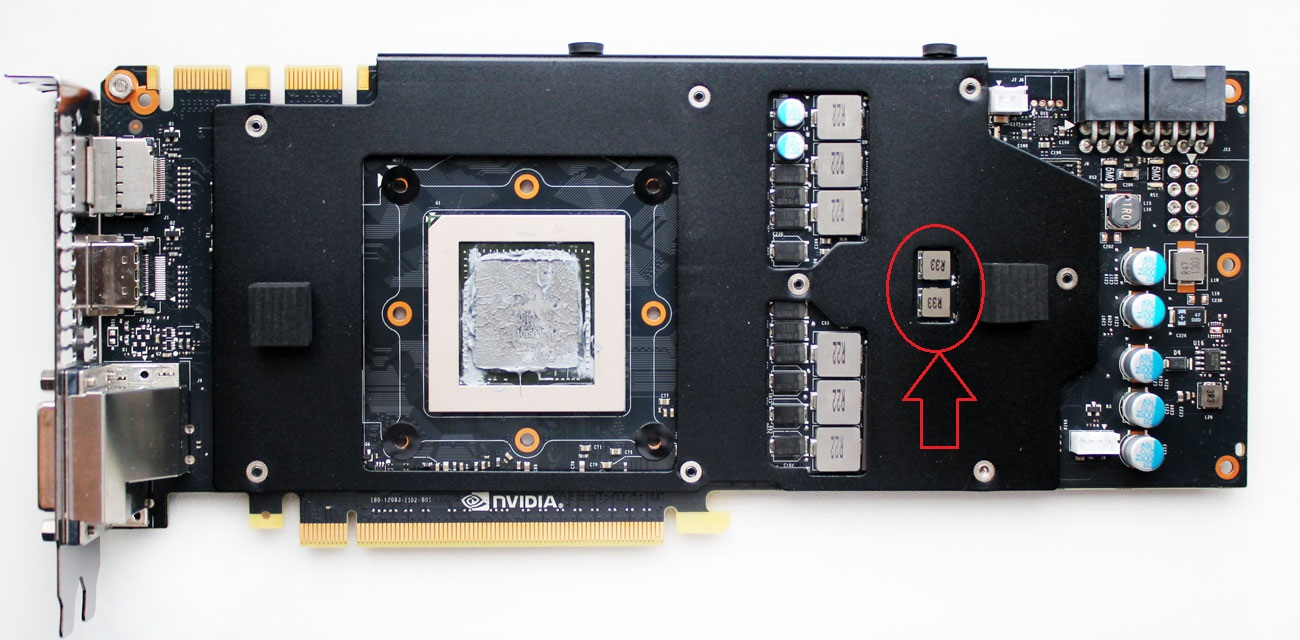 Масло попадало под пластину через отверстия. На промасленных элементах питания собиралась пыль и пробило где-то в районе указанном на картинке (насколько смог рассмотреть под пластиной). Карту не разбирал, так как уехала в гарантию.