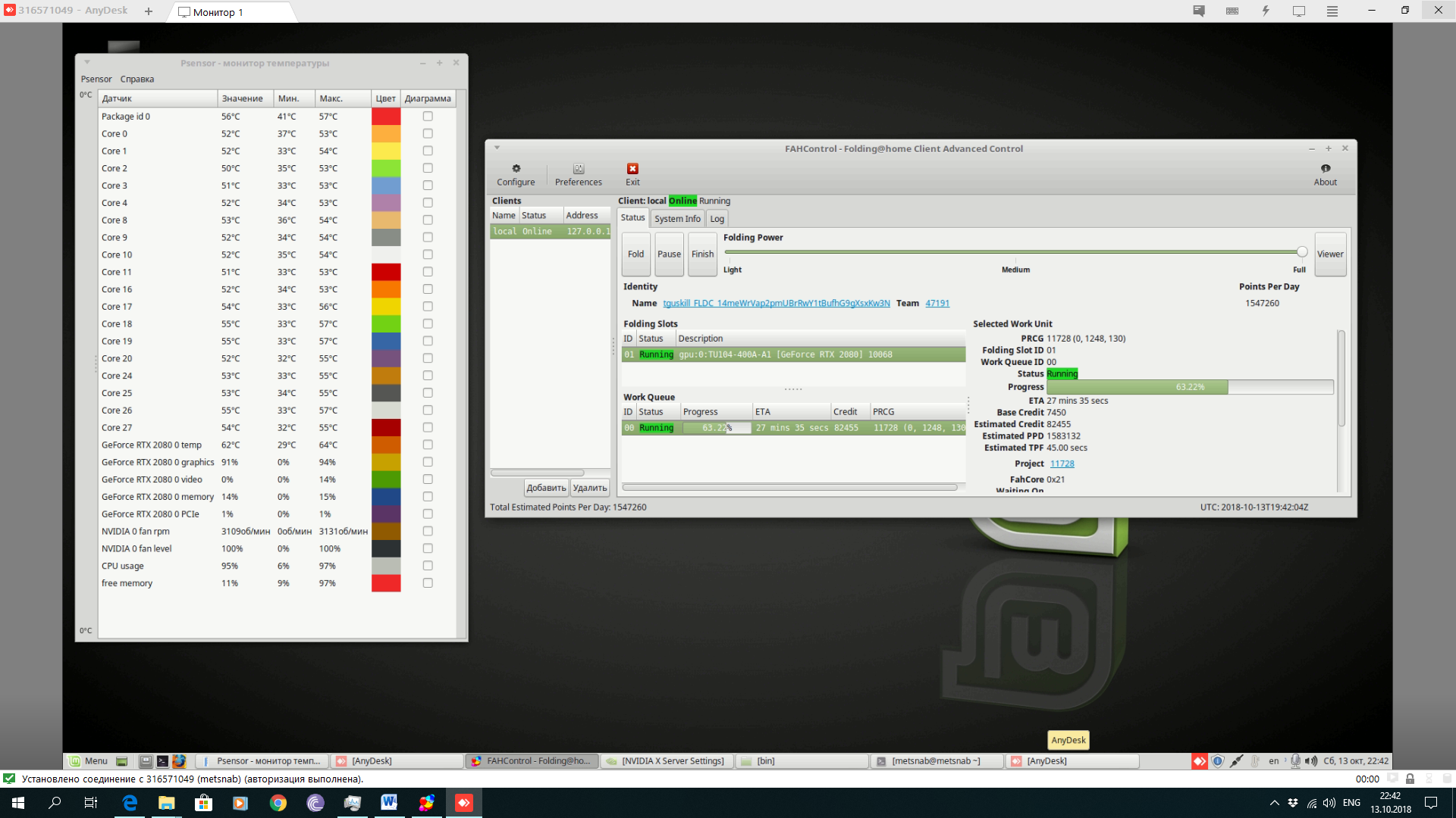 Всем привет. Купил 2080 гигабайт виндфорс. Карта очень горячая. поэтому стоит в системнике одна. В линуксе на 2 ГГц ППД в районе 1.5 млн, что почти в 2 раза (900К) больше, чем у 1080. Скриншот прилагаю