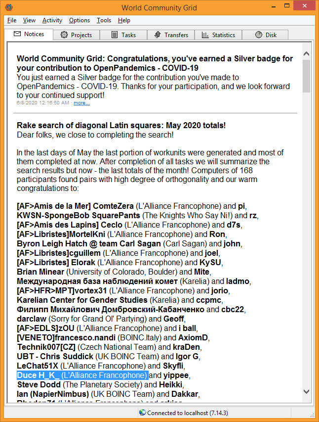 Важно знать: Для проектов актуально проверить, выставлено ли в в ваших настройках учетной записи на оф. сайте проекта, что вы разрешаете использовать ваши данные о ваших набранных очках и компьютеров в различных сайтах статистики, таких как Boincstats.com. Это особенно касается проекта Einstein@home, который по умолчанию выставляет в настройках как "не разрешать публикацию данных". . Это было обновлением для проектов, согласно GDPR (General Data Protection Regulation). Поэтому сейчас и наблюдается ситуация в статистике, что считает, допустим, за проект 30 человек, а на сайте показывает, что только 4! Пожалуйста, проверьте свои настройки! __________________________________________________________________ Важные новости проектов: