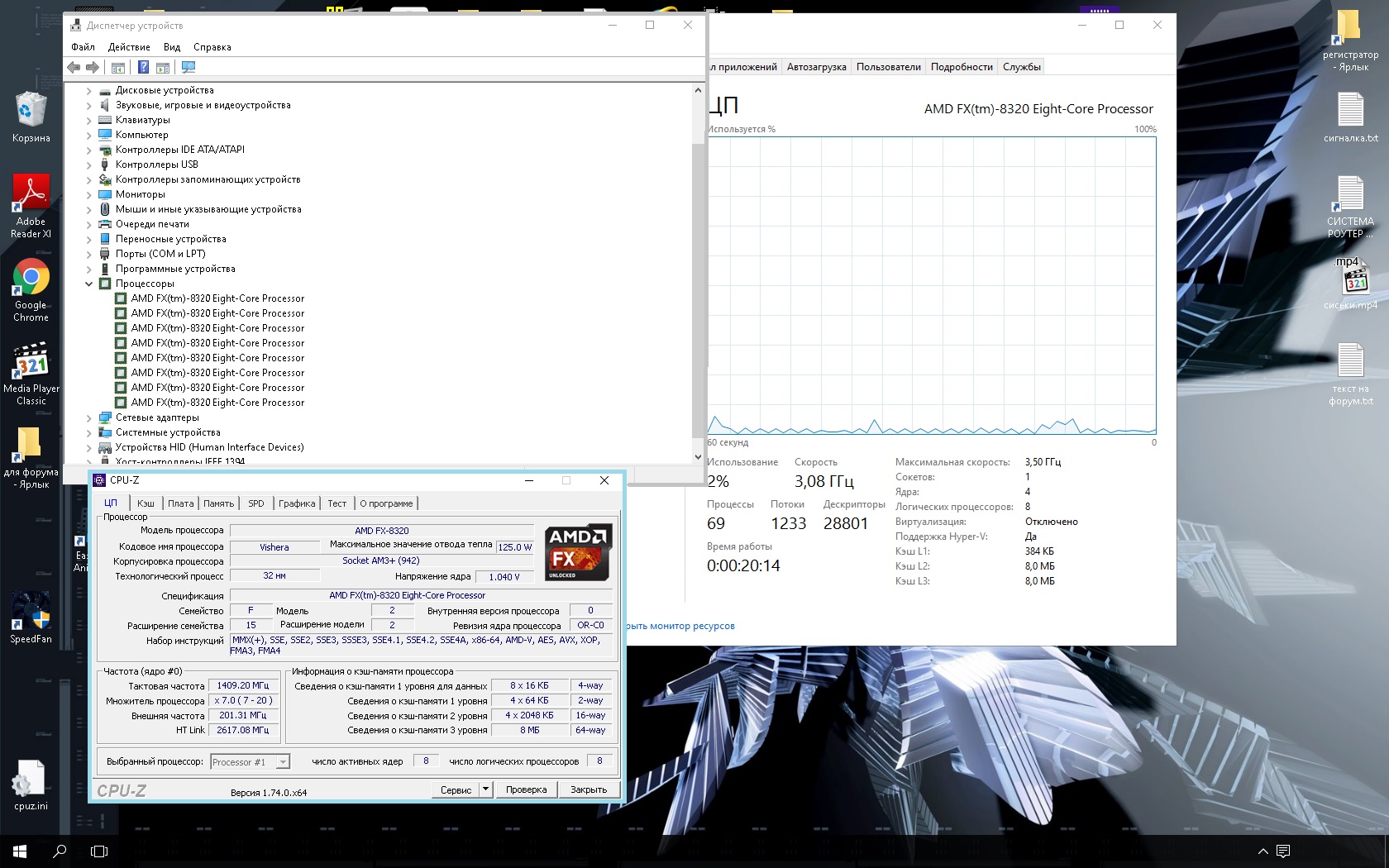 Проблема такая. Купил, значит, q9400 на днях. Собрал комп, поставил охлаждение Titan Vanessa s-type - старичок, но охлаждает хорошо. Запустил, поставил винду на новый hdd. Биос писал "unknown cpu deteckted" и выдавал общую температуру проца в 85, ясен фиг глюк. Обновил биос с сайта разработчика мат.платы под мой процессор. Всё нормально, но температура в простое около 54 градусов, а в серфинге итернета достигла 68, что, как мне кажется, много. Сейчас немного сбил температуру, снизив вольтаж. И ещё почему-то не изменяются частота и множитель проца в режиме manual. В общем сейчас при вольтаже ~1.135 V, оборотах кулера 2500, тактовой частоте почему-то всего 2003 Мгц(смотрю через cpu-z) и множителе 6 температура ядер 42-47, а cputin 31 градус. В общем, с чем может быть связано такое поведение процессора? Это может и хорошо, но при частоте всего в 2000мгц особо и не поиграешь, брал то я проц с надеждой разогнать его хотя бы до 3,3.