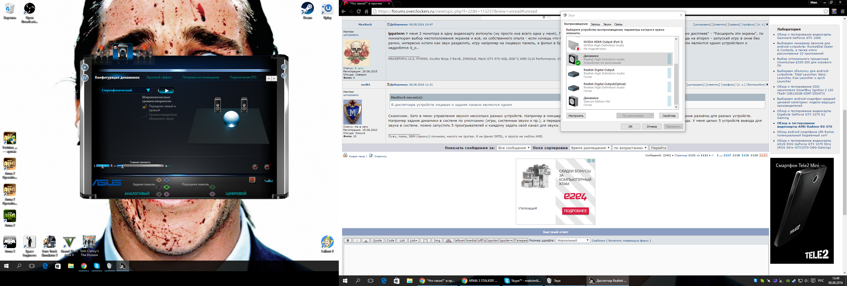 Да легко, когда домой приду. Попробовал, естественно всё работает. Спереди воткнул ухи, сзади колонки. Оба работают от независимых источников и регулируются раздельно. В чём я лично и не сомневался. А то уж грешным делом подумал что на последней сборке Win10 новый косяк. Фсё пучком играет и не икает, как у некоторых. Я вообще-то реалтековский звук редко юзаю, для скайпа в основном. По умолчанию у меня звук на телике, а у медиа плеера по оптике к ресиверу.
