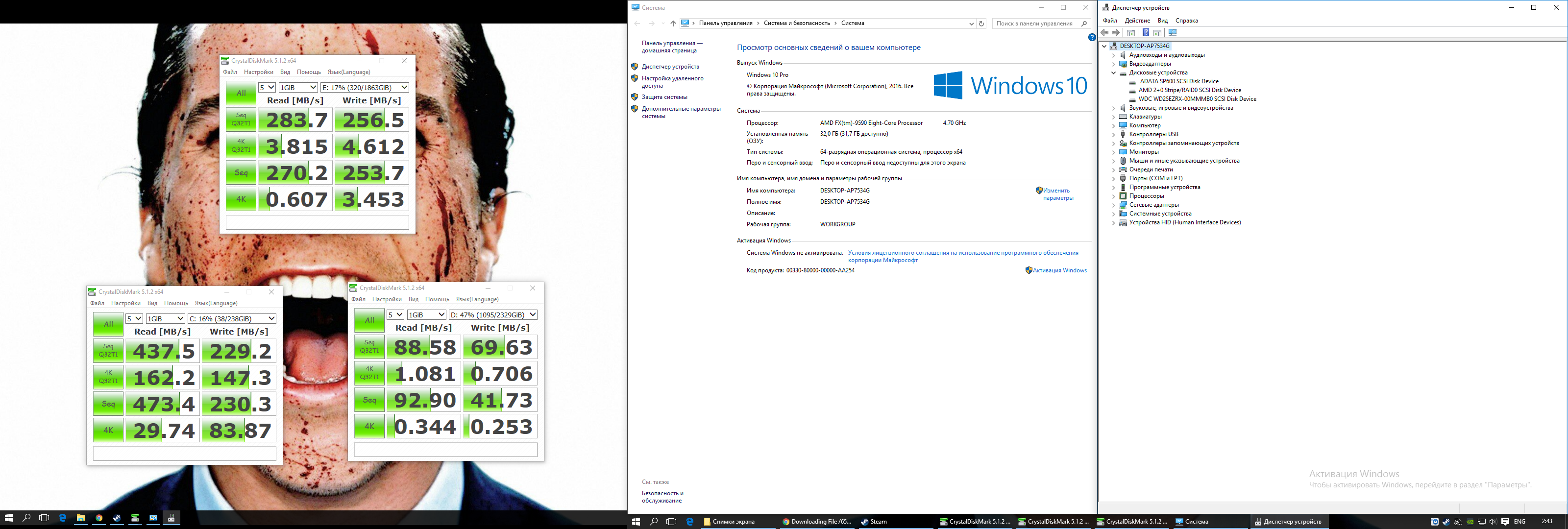 Артём Уже ОСь переустановил и всё заработало, правда не понятно в AHCI или IDE, результаты CDM вилами по воде писаны, разброс дичайший и зависит от температуры под мышкой сатаны, сведения лун в галактике YXG81ZRY96 и настроения создателя SB950 До начала извращений