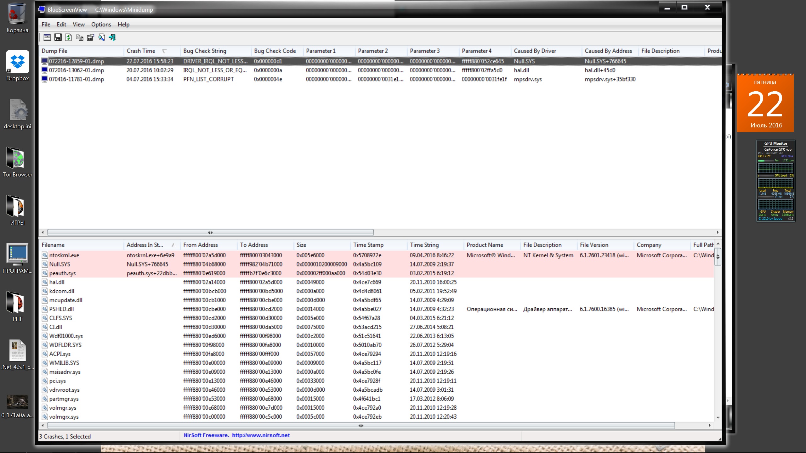 Файлы, содержащие сведения об этой проблеме: C:\Windows\Minidump\072016-13062-01.dmp https://yadi.sk/d/EcWi3_H_tUPtv C:\Temp\WER-32390-0.sysdata.xml