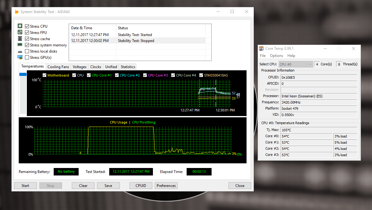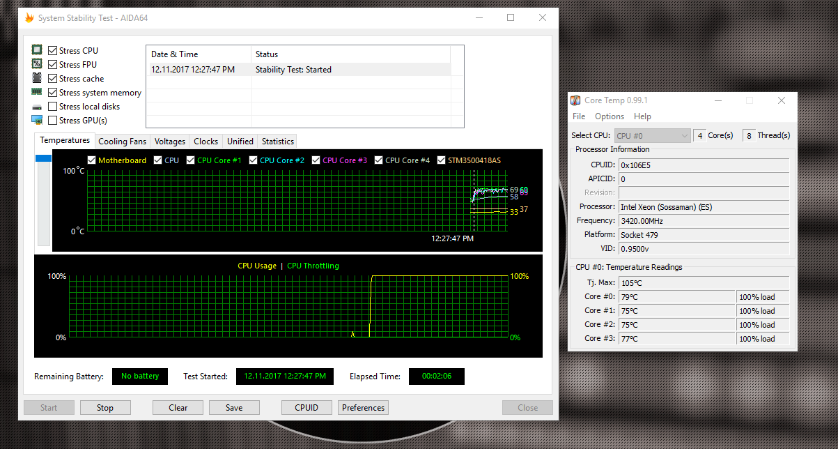 Компьютер вроде как работает нормально, синих экранов нет, игры работают. Но хотелось бы узнать, посмотрите на скрины и скажите, нормальная ли это температура в простое и при стресс тесте.