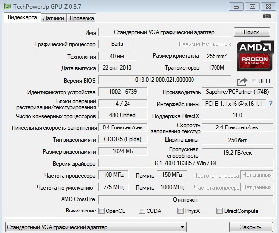 Иван555 Поставил у знакомого за место р9 270х, дрова 17.7.1, мотитор 1920х1080. Запустили, те же синие вертикальные полосы на черном, далее рабочий стол с вертикальными полосами (рябь). Началась автоматическая настройка видео адаптера? Разрешение более 1440х1050 выставить нельзя, в gpuZ и диспетчере карта 6850 указывается как "стандартный VGA графический адаптер", версию дров показывает 6.1.7600.16385, в МСАй афтербанере частоты, напруга не просматривается. Попробовал накатить "свежие" дровишки - вылазит Ошибка 182 (невозможно определить видеоадаптер)! Я вот думаю, а может софт карты полетел, может ее как то перепрошить можно/нужно? Нагружать игрой не стал, есть ли смысл? Подскажите плиз, как дальше, что возможно сделать?