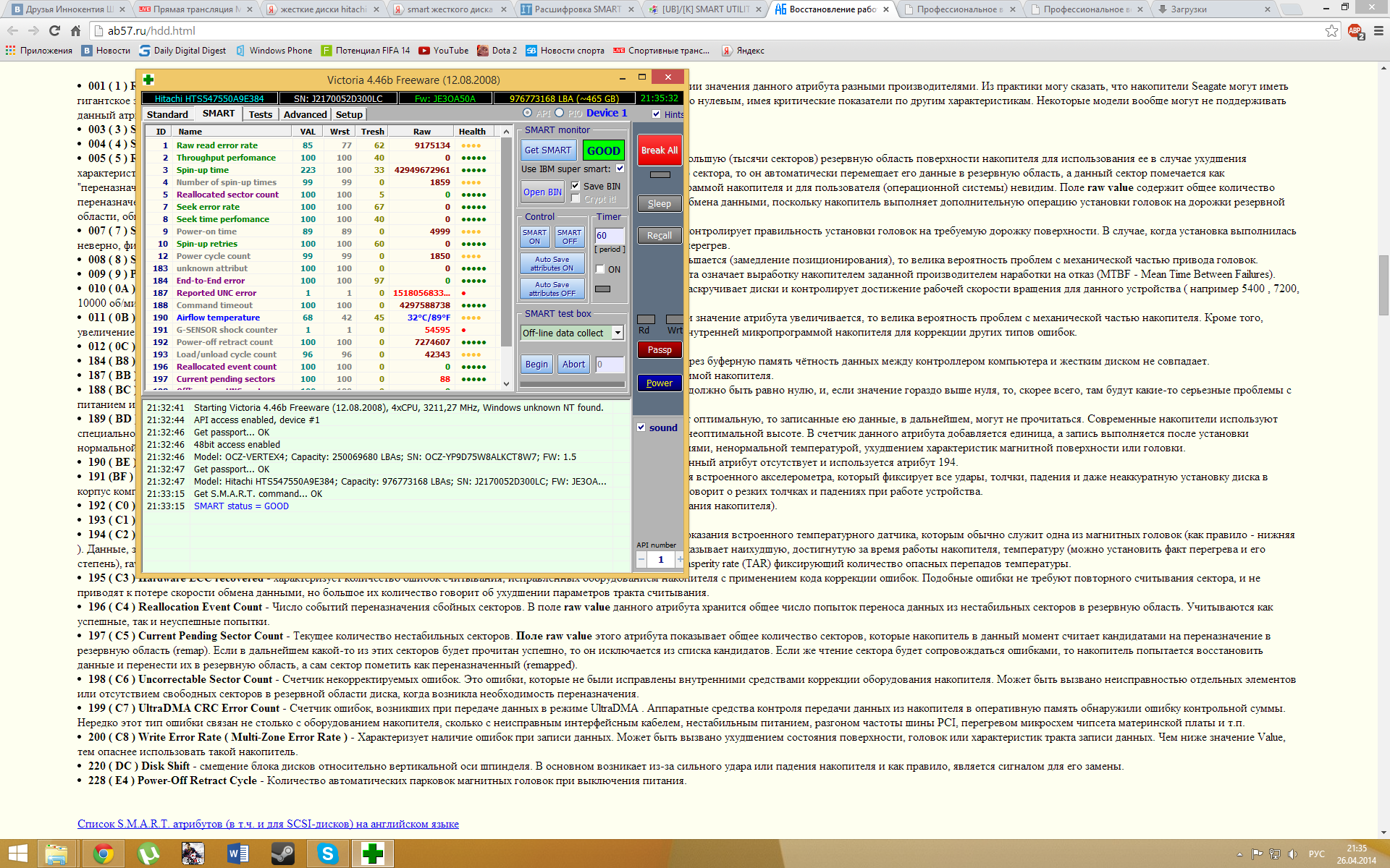 Это с ноута хард. На самом ноуте не загружается ни установленная винда, ни инсталяция с флешки. Подключил к системнику - Винда грузилась раз в 5 дольше, а под системой у него неральные задержки чтения с зависаниями. Ноут падал, но очень давно, так же имеется второй хард 3.5 тоже Хитачи, с такими же признаками, но без СМАРТА. Мб у Хитачей 2-3 лет давности есть свои косяки и решения для их устранения?