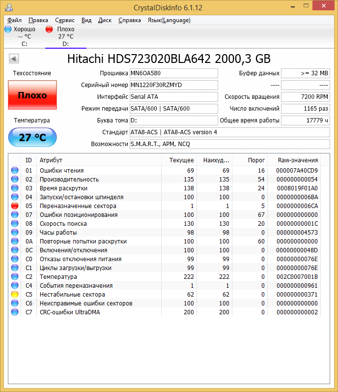 Господа нужен совет, системный диск на компе wdc wd6000blhx-01v7bvo винда начала долго грузиться и тупить после долгого ожидания выходила на рабочий стол курсором можно елозить но ничего открыть нельзя, при этом идет постоянное обращение к диску. Снял подключил к буку внешним носителем прогнал всякие виндовские проги дефрагментация, автомотическое устранение ошибок и т.п. Запустил программу CristalDiskInfo 5.2.1 Он кажет на этот диск "Тревога" и желтым горит ID C5 нестабильные сектора Текущее 200 Наихудшее 200 Порог Raw значения 000000000003 Какие мои действия по устранению и как это сделать. Поможет ли полное форматирование?