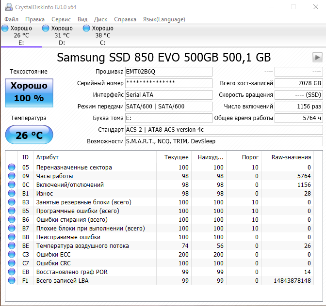 ========================================= Перед публикацией скриншотов Crystal Disk Info в меню "Сервис" >> "Дополнительно" >> "Raw-значения" выберите вариант "10 [DEC]". Это упростит восприятие информации. В меню "Сервис" ставьте галочку "Скрыть серийный номер".