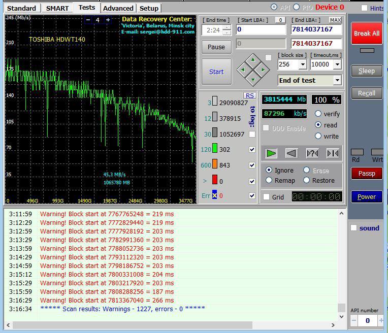 Всем привет! Взял новый диск - TOSHIBA S300 (HDWT140UZSVA), 4Тб. Он тихий, холодный, но график теста совсем не порадовал... Раньше на новых дисках у меня таких провалов не было, как и зелёных, а тем более оранжевых блоков. Что посоветуете - сразу обратно сдать или ещё помучить как-нибудь?