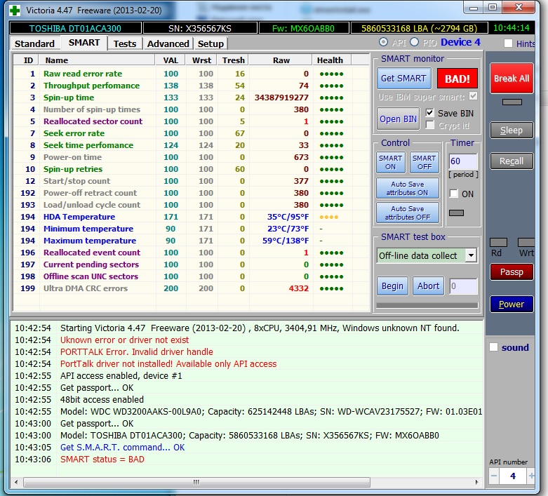 BRAWA Статус BAD должен быть при любом атрибуте, значение которого ниже порога. А этого нет. Но сам перегрев естественно может быть причиной сбоя в логах смарта. Все равно не приятно, что каждый раз при включении компа, BIOS будет требовать заменить диск и показаниям смарта нельзя верить.