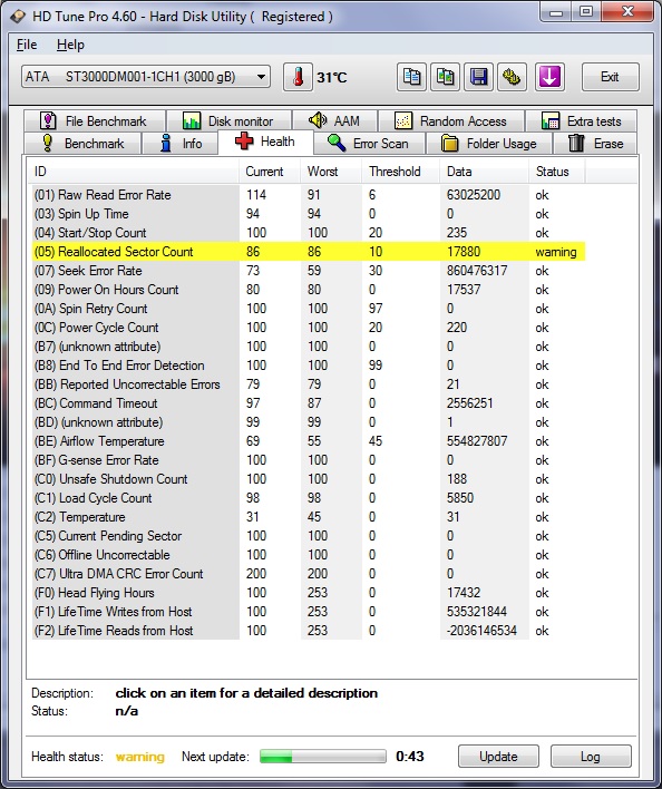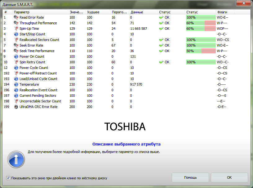 Так вот, программа Ashampoo HDD Control ругается на состояние HDD Toshiba и с каждым днем показывает меньший процент состояния и производительности.