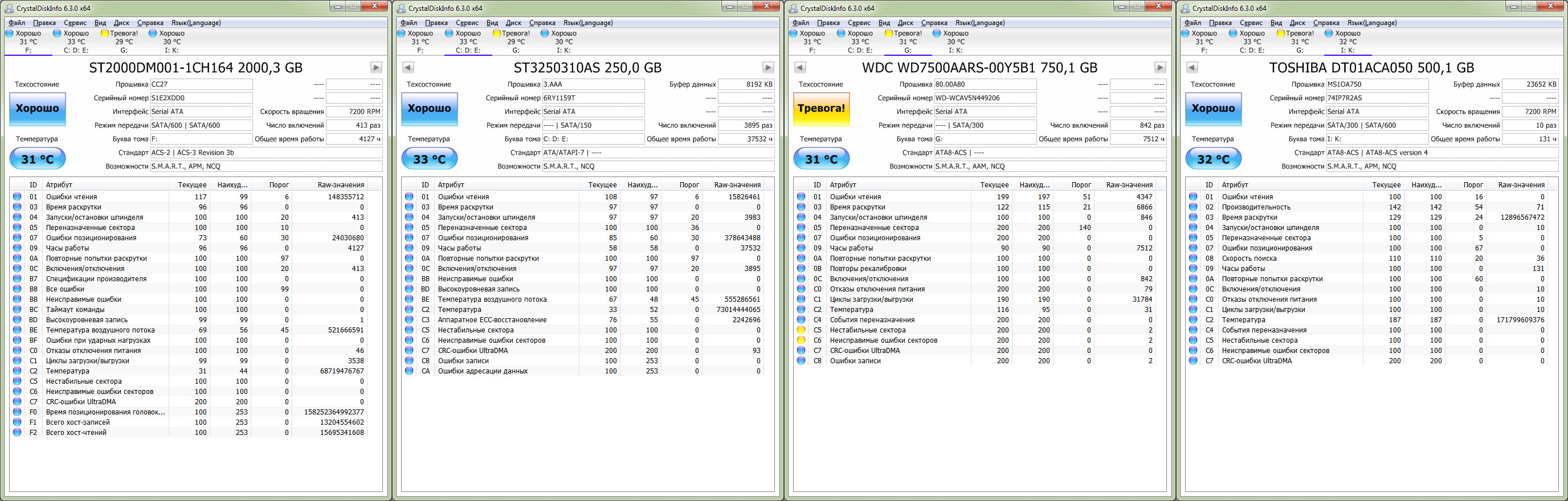 Здравствуйте. В компе стоит 4 HDD. Seagate 2TB (ST2000DM001-1CH164), Seagate 250GB (ST3250310AS), Western Digital 750GB (WD7500AARS-00YB1) и Toshiba 500GB (DT01ACA050). Toshiba 500GB совсем новый, поставил его временно. Так вот, программа Ashampoo HDD Control ругается на состояние HDD Toshiba и с каждым днем показывает меньший процент состояния и производительности. Western Digital имеет тоже не 100% состояние, но на него не ругается и состояние не меняется. Поставил CrystalDiskInfo, а там совсем наоборот. У Toshiba состояние хорошее, а у Western Digital плохое. Выкладываю SMART (CrystalDiskInfo) всех HDD. Скажите, что с ними не так и вообще каково состояние всех HDD.