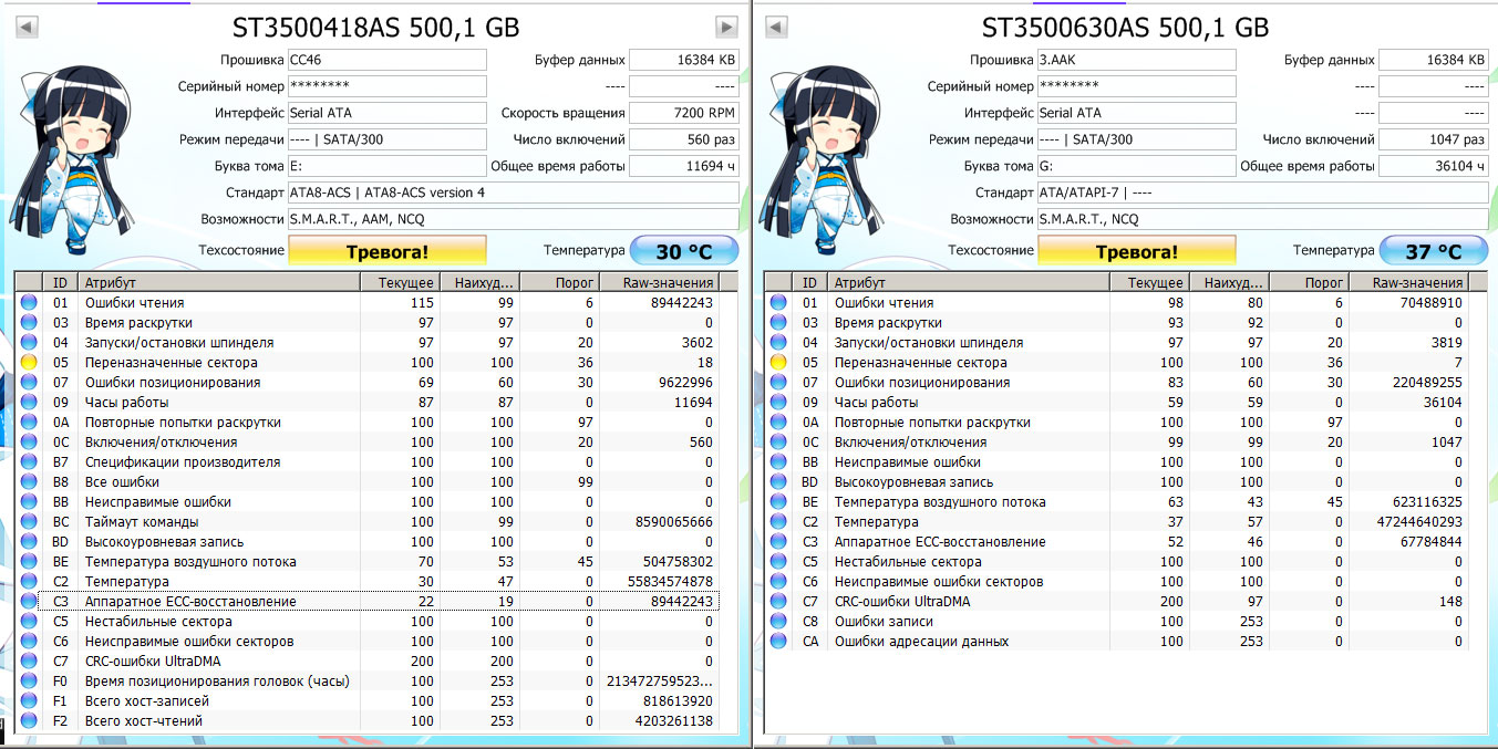 Здравствуйте. Решил проверить, почистить и подготовить к новому проекту монтажный комп. Посмотрел смарт двух дисков и озадачился. Помогите советом, критично? Не хочется в середине проекта получить "сюрприз". P.S. Комп не мой, так что, к сожалению, оценить диски по другим параметрам на дистанции (шумы, стуки, глюки системы и т.п.) не представляется возможным, пока по акустике все в норме.