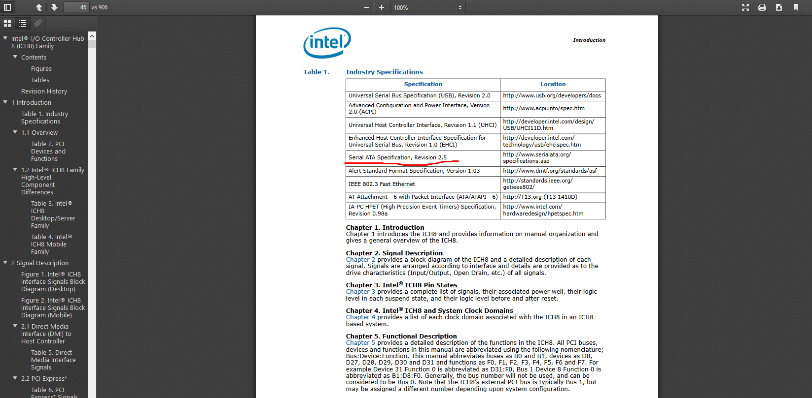 Так я в спецификацию моего Sony Vaio смотрел, там SATA Rev.1. И вот в интеловской статейке напечатано "Intel® I/O Controller Hub 9 (ICH9) Family 1.5 Gb/s SATA", и выше чем 1.5 Gb/s там значений не встречается. Та статья от мая 2012 года под названием "Intel® I/O Controller Hub 9 (ICH9) Family. Specification Update. — For the Intel® 82801IB ICH9, 82801IR ICH9R, 82801IH ICH9DH, 82801IO ICH9DO, 82801IBM ICH9M, 82801IEM ICH9M-E, and ICH9M-SFF I/O Controller Hubs" https://www.intel.com/content/dam/www/p ... update.pdf