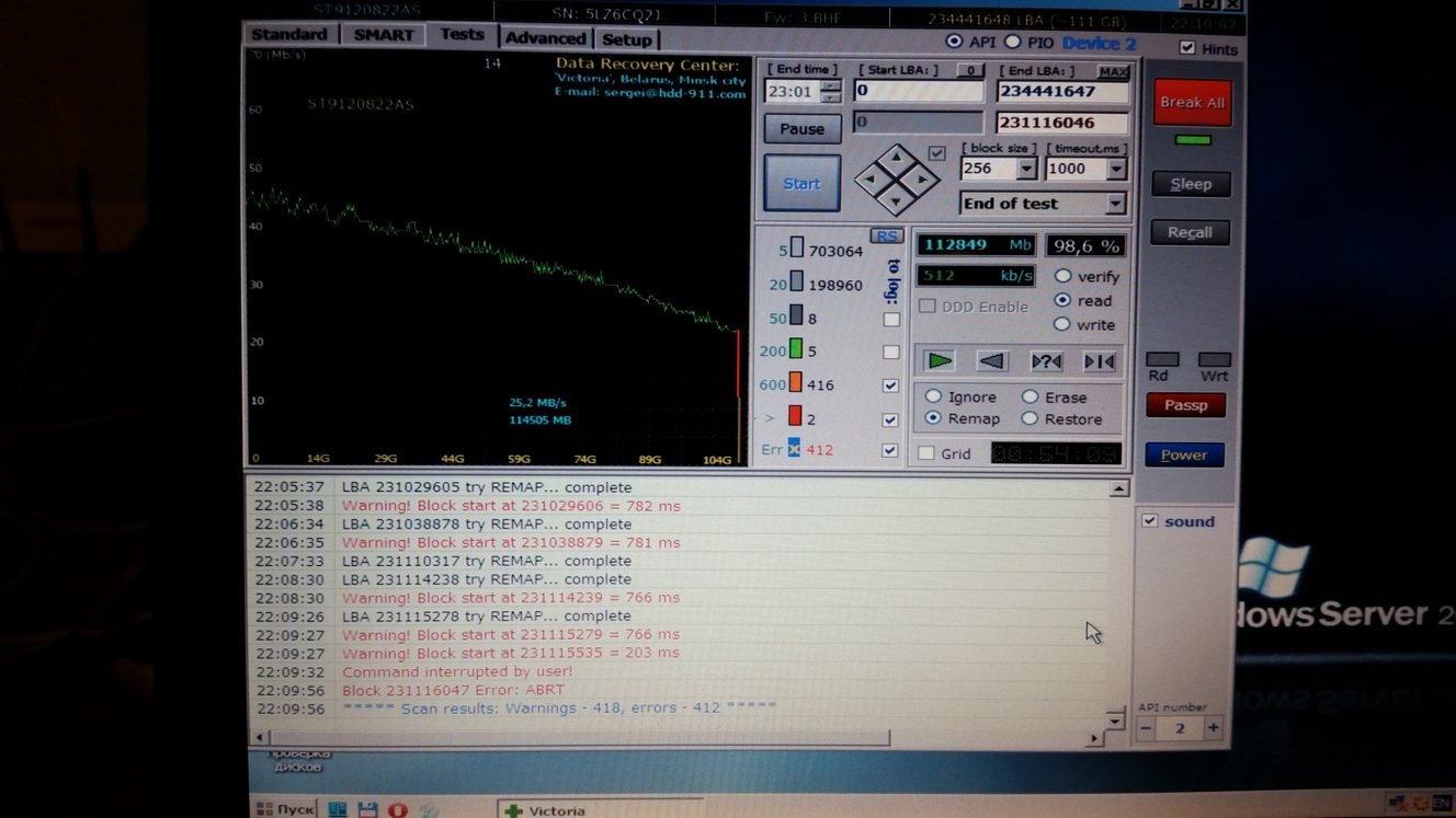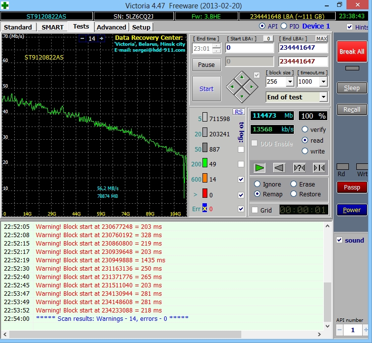 Доброго времени суток, ув. спецы. Принес хороший знакомый мне Packard Bell ALP-Horus G с проблемой "долго грузится винда". Винда реально грузилась минут 10-15. Протестировал хард (Seagate Momentus 5400.3 ST9120822AS), получил такие результаты: