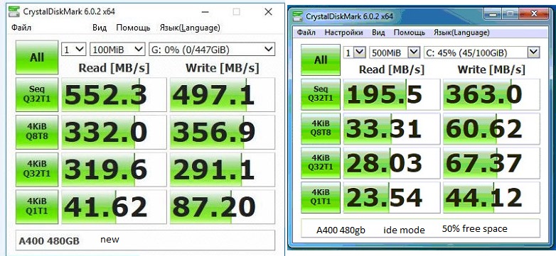 дырка этот ваш А400. из блистера выдавал скорости на уровне 860 ево. забил наполовину, воткнул в ноутбук, сата3, в режиме ide скорости на скрине. может в режиме ahci было бы лучше, не знаю, тестить некогда. благо не мое, себе бы такое не поставил.