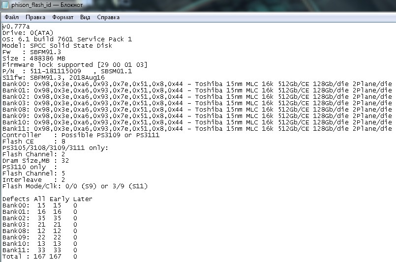 Действительно, MLC, смущает разночтение заводских бэдов, 606 в CDI и Патриот боксе против 167 в flash id. вот это странно. 167 и маловато для такого флеша, причем очень похоже на ~1/4 от 606 (а флеш сгруппирован по 4 кристалла на CE). просьба - запустить с ключиком b (phison_flash_id 0b или ноемр как 0b указать), и все сохраненное мне личку на изучение скинуть.