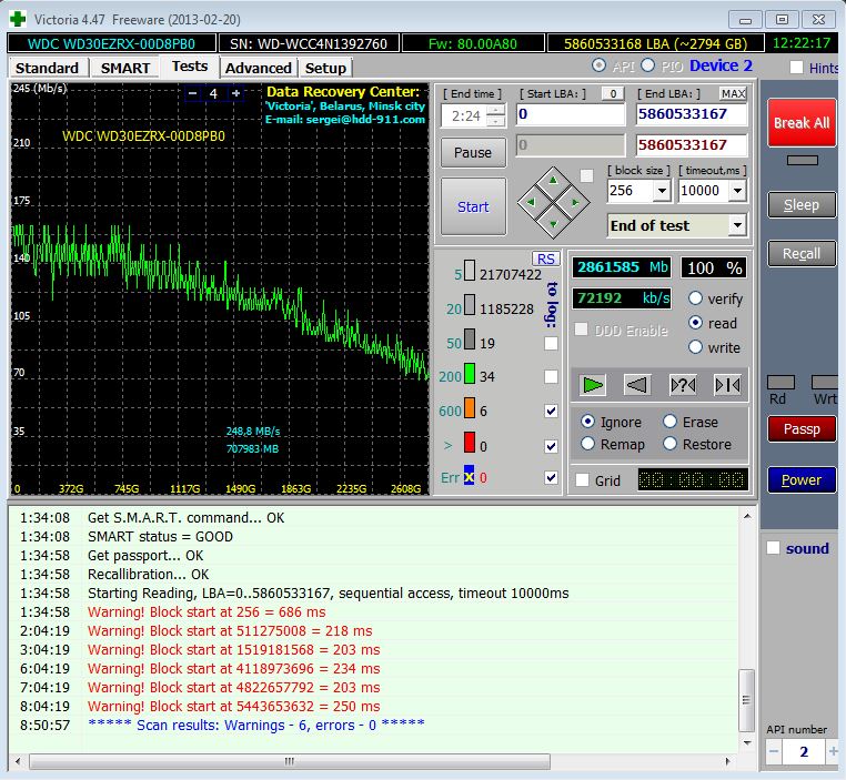 Sania. ну вы писали что в ней можно проверить скорость записи и чтения, а график чтения я уже и так получил в другой программе. Я блоки хотел проверить, а что она и это умеет делать я не понял. Вот посмотрите, поставил на ночь тест вот что получилось. Что скажите? (вообще как я понял при запуске из под винды, эти программы показывают результаты не очень точно, так говорят)
