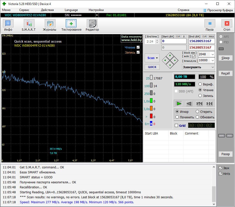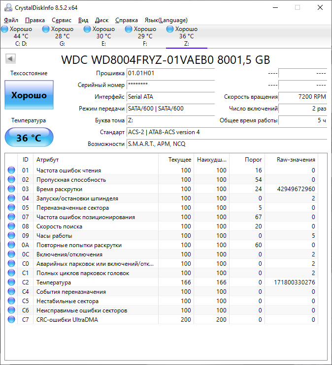 Итак, информация по WD Gold 8tb WD8004FRYZ, может будет для кого-то полезной. Дата производства 28.02.2020, Таиланд. Данный диск по сути WD Ultrastar DC HC320 от HGST/Hitachi (даже надпись на этикетке есть Powered by Ultrastar). Внутри 5 пластин по 1600 Гб. По температуре: Условия: корпус - be quiet! Dark Base 900 Pro rev.2, диск в внизу в корзине, непосредственно обдувается 2 вертушками - фронтальной и снизу, всего в корпусе 4 вертушки на вдув и 4 вертушки на выдув. Температура в помещении 25-27 °C. Диск в простое - 35-37 °C. При записи 800 Гб бэкапа, примерно через 50 минут разогрелся до 40 °C. По шуму: системный блок стоит на столе, рядом с монитором, в простое диск вообще не слышно, при работе с диском есть еле заметные звуки - в общем, более чем доволен (может, конечно, повезло с конкретным экземпляром). Смарт, тесты скорости под спойлером.