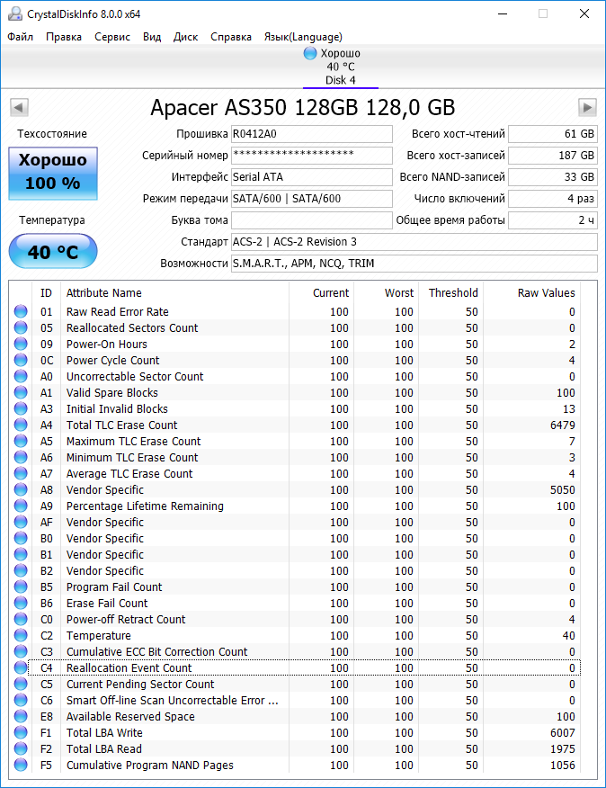 ========================================= Перед публикацией скриншотов Crystal Disk Info в меню "Сервис" >> "Дополнительно" >> "Raw-значения" выберите вариант "10 [DEC]". Это упростит восприятие информации. В меню "Сервис" ставьте галочку "Скрыть серийный номер".
