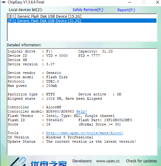 Здравствуйте, помогите пожалуйста разобраться, имеется флешка нонейм вроде как на 32 гб, отформатировал её в НТФС, пользовался и как-то она странно начала работать то файлы на ней типа битые то пропадали и ничего не занимали, вроде как получается что размер её реальный меньше. Короче решил я её отформатировать низкоуровневым форматированием через программу Hard Disk Low Level Format Tool, отформатировал, потом средствами виндовс ещё раз отформатировал, высунул и вставил в телефон - не определяется, вставил в комп - не появляется но в диспетчере задач её видно, восстановил флешку с помощью программы AlcorMP но размер флешки стал 15 ГБ, кстати до форматирования её VID был 0000 PID 7777, а сейчас VID 058F PID 6387, на чипе на флешке написано 29f16b08/cmfp, так же на нём есть цифры 16 гб, что тоже вызвало у меня подозрение, помогите разобраться это получается теперь стал реальный размер флешки или я её поломал стоит ли пытаться вернуть 32 гб? Помогите найти программу под неё чтобы восстановить, а то меня как занесло на китайские сайты это ужас был, еле поудалял потом всё. Два дня уже мучаюсь устанавливая всякое говно на комп. Так же есть аналогичная флешка но на ней до сих пор вроде как 32м гб, скрины двух флешек прилагаю.