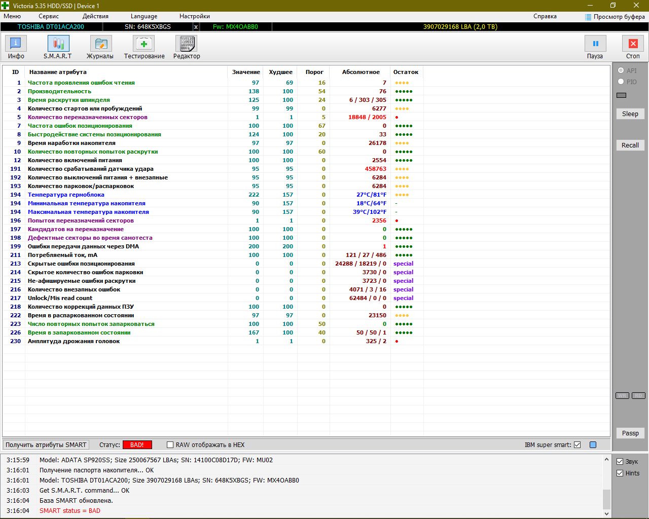 Нет. Дисков 4. - ADATA Premier Pro SP920SS 128 Gb, Toshiba DT01ACA200 2.0 Tb (вот он загибается), Toshiba DT01ACA200 2.0 Tb (фонотека), WD 3200 AAKS 320 Gb (реплеи и всякая всячина от домашних. Но он с красными секторами тоже, не так конечно краснеет но есть).