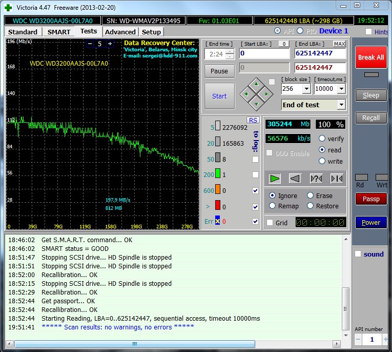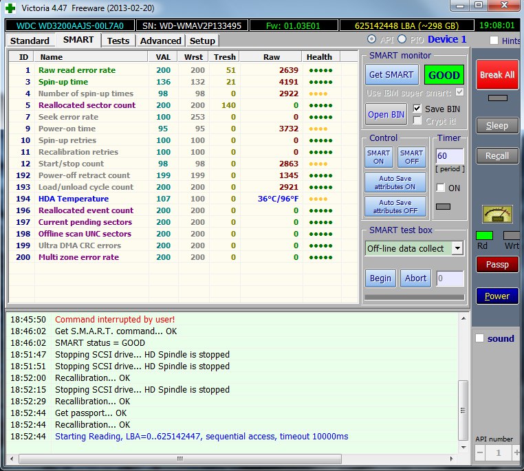 Здравствуйте. Стучит буквально несколько секунд жесткий диск wd3200aajs при запуске компьютера. Никаких проблем при использовании не имеется. Но здравый смысл говорит, что просто так стучать бы не стал. Первый аргумент в smart показывает высокое значение, не типичное для дисков wd. Фатально ли это и стоит ли беспокоиться? И есть ли способ решить эту проблему? Прилагаю скриншоты из 'Victoria'.