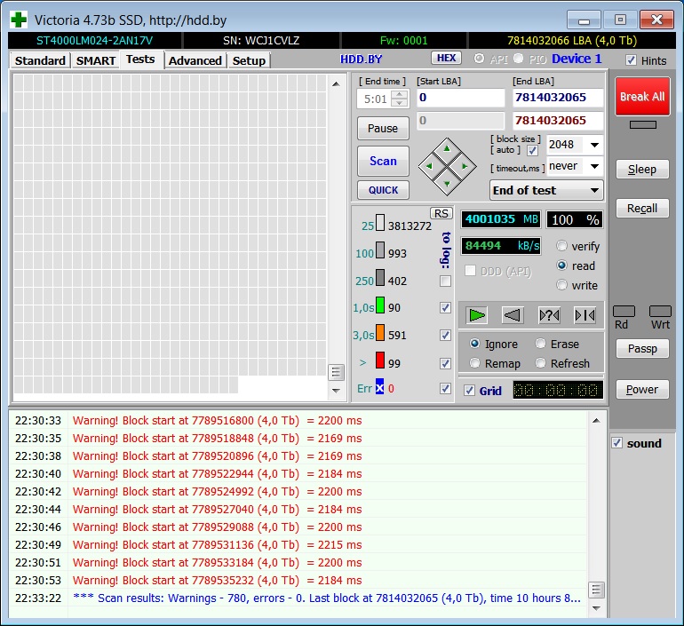 Купил позавчера внешний жесткий диск Seagate backup plus STDR4000200 и решил его протестировать через Victoria 4.73b (скриншот прилагается). Не понравилось большое количество секторов с задержками до 1с, до 3с и более 3с (и в момент считывания большого их "скопления"подряд из жесткого издавалось потрескивание...). Думал пойти вернуть, т.к. предположил, что жесткий диск некачественный и эти сектора в самой ближайшей перспективе кандидаты в бэды...