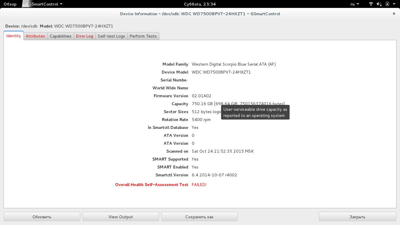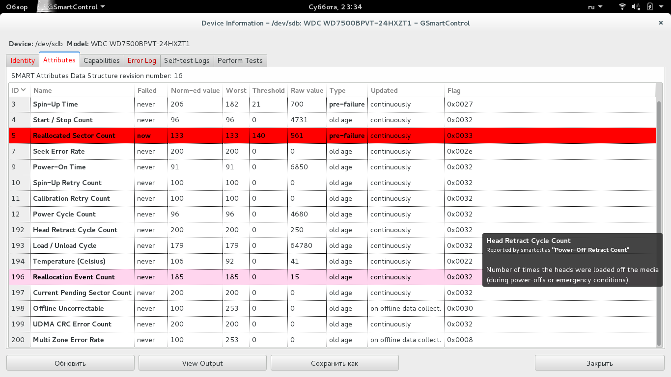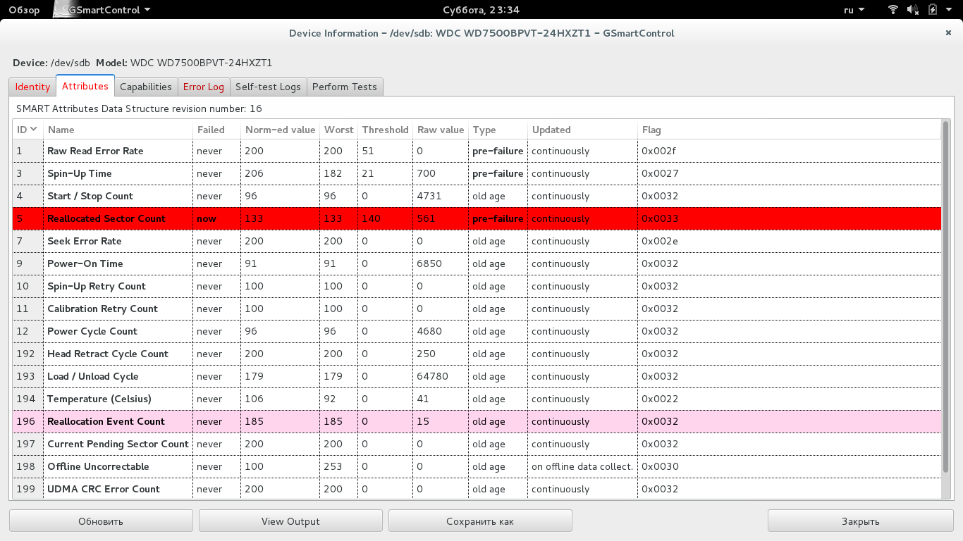 Имеется ноут с диском Western Digital Scorpio Blue SATA (AF) модель WDC WD7500BPVT-24HXZT1. Параллельно есть SSD 32 гига. Винда стояла на харде, часто глючила и вырубалась, последний раз не смогла восстановить себя и был потерян boot раздел на hdd, поэтому установил Debian вместо винды 7. Debian стоит на SSD. Работает стабильно, но иногда полностью зависает. Оперативку проверял полным memtest-ом. Без ошибок. На Debian-е в "дисках" жестак WD сразу высветился красным. Reallocated Sector Count и Reallocation Event Count горят красным и розовым соответственно. Имеется также запись Overall Health Self-Assessment Test - FAILED! и Basic health check - FALED! В программе "Диски" пишет "Возможно диск скоро сломается". На сколько это опасно? Нужно и как часто делать резервную копию? Менять ли хард?