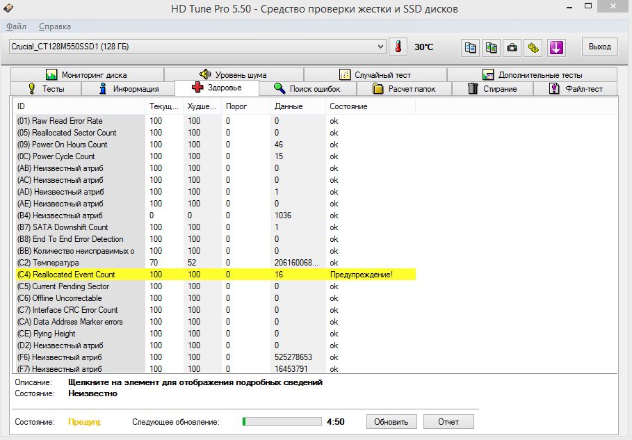 Вчера взял Crucial M550 на 256 Гигов. В общем всё вроде бы ок, но есть один нюанс, Reallocated Event Count уже на 16 с рождения, это вообще нормально или стоит забеспокоиться?
