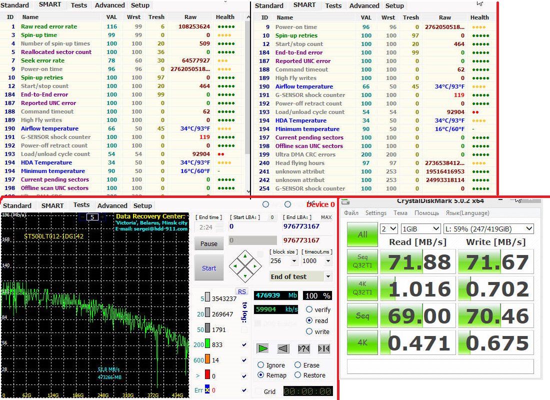 Maccanabis Пилятся эти диски очень быстро. Смарт не правильно читается из-за проблем в служебке. Читает медленно из-за проблем с головами. Раз данные важные, рекомендовал бы сразу в DR фирму нести. Потом, когда доступ совсем пропадет, уже будет бесполезно дергаться. Доноры к ним подбираются очень плохо. И новые головы будут сразу сгорать на царапинах. Доноров обычно нужно много. Учитывая их стоимость и длительность процесса, цена будет не маленькая. В лучшем случае 1 из 10 удается восстановить и далеко не всю информацию, после того как перестают видеться. Пока видится есть шанс спасти все. Но читать надо выборочно и очень аккуратно, профессиональной программой рассчитанной на работу с дисками имеющими физические проблемы. Умеющими строить карту головок и объектов файловой системы. Все программы не имеющие технологического доступа к микропрограмме HDD на такое вычитывание на рассчитаны.