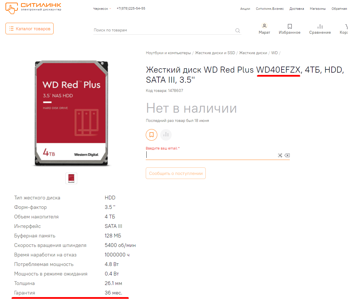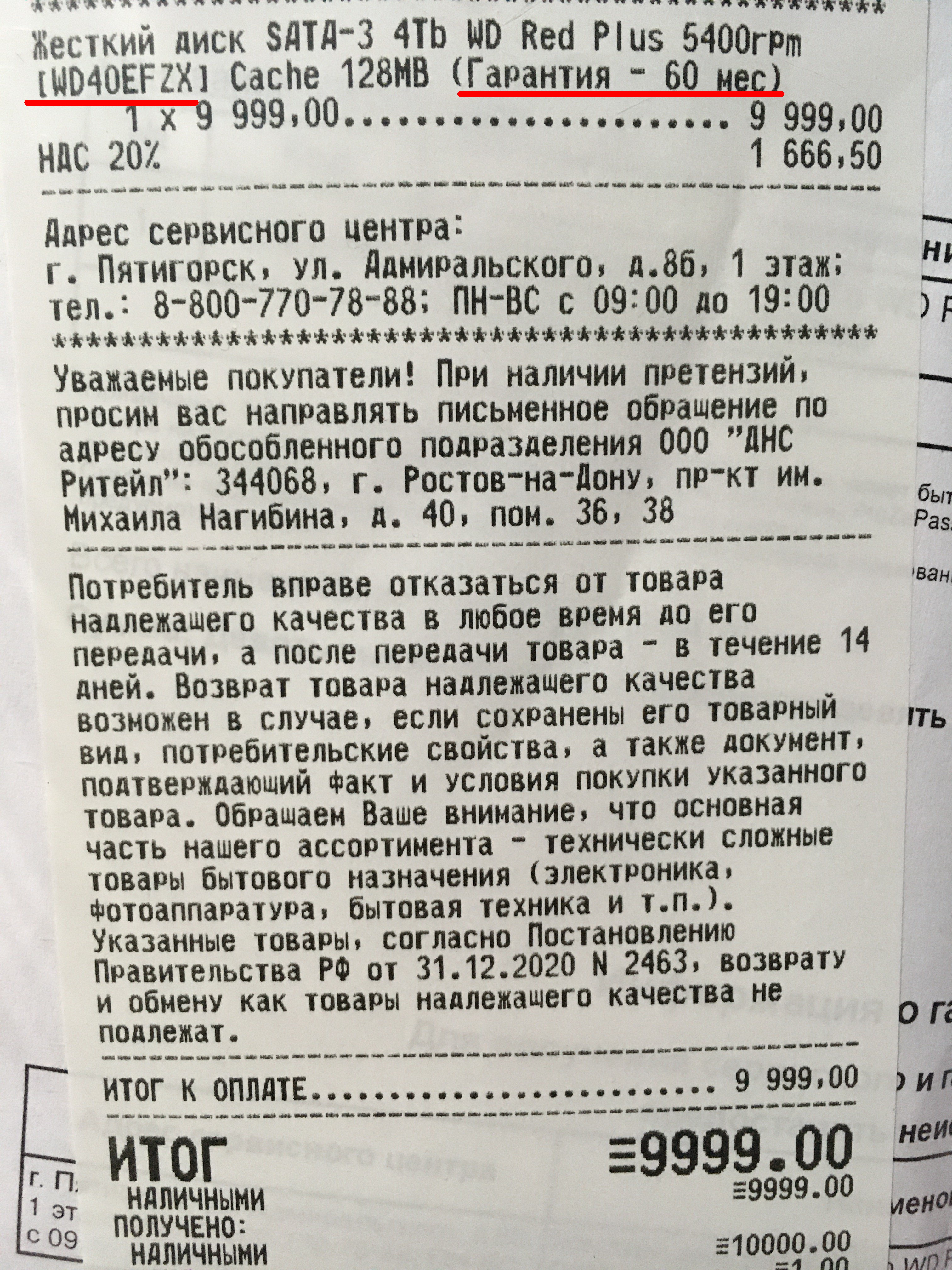 Ребят, взял второй диск - WD Red Plus [WD20EFZX] на 2ТБ, также гарантия 60 месяцев по чеку, в то время как в "Ситилинке" 36 месяцев. Ещё момент: у WD Purpleгарантия 36 месяцев + SMR, вроде, и почему-то "фиолетовые" дороже аналогов из линейки Red Plus
