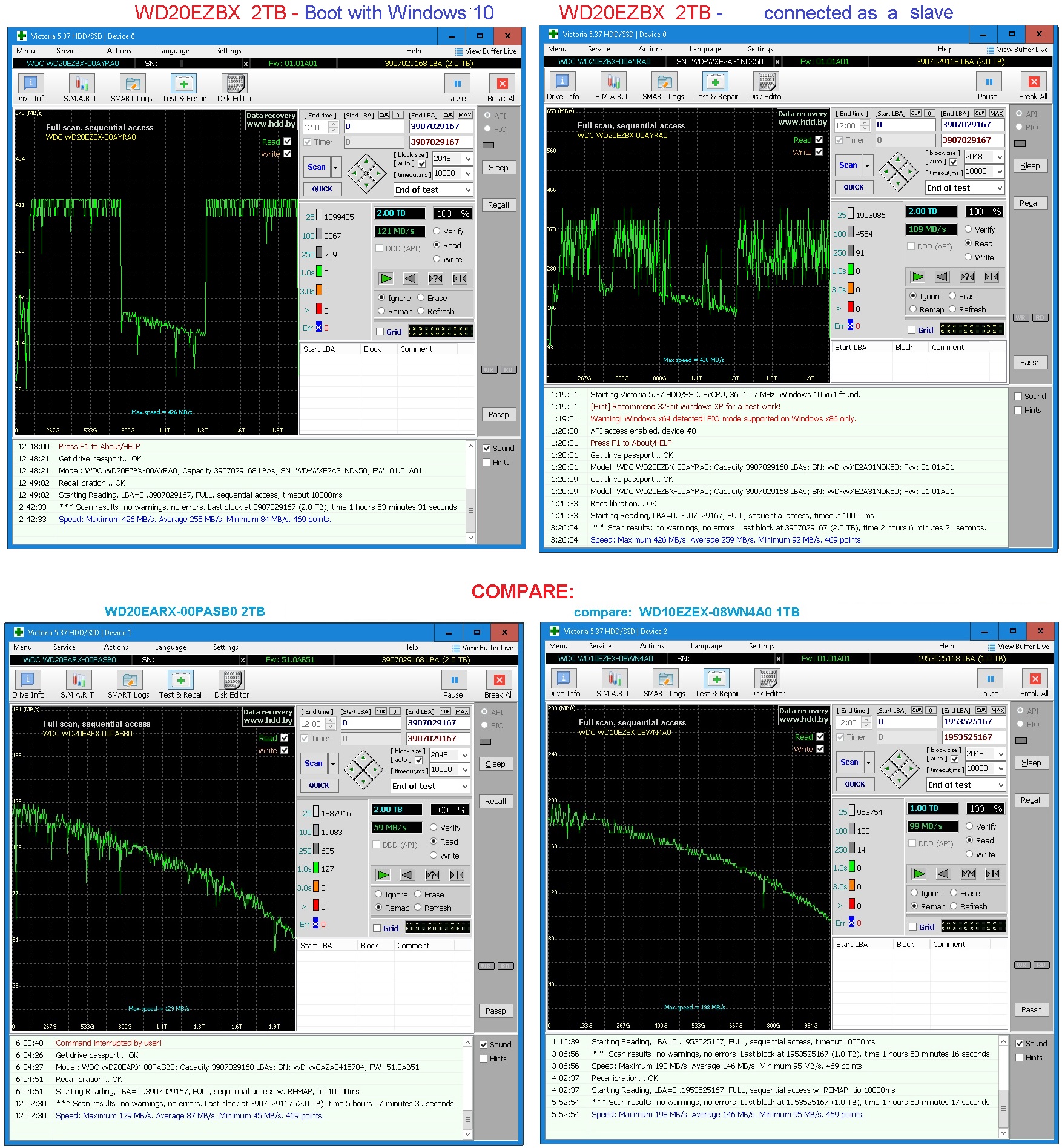 Возвращаясь к моему сообщению о WD20EZBX 2TB, 256 MB, 7200 об./мин, купленному мной 17 декабря, 2021, и успешно эксплуатируемым (нет ни шума, ни щелчков, ни "тормозов" в обычной ненапряжённой работе) два графика (1й и 2й сверху WD20EZBX), заметно отличающиеся в сравнении со старыми WD20EARX (внизу-слева) и WD10EZEX (внизу-справа):
