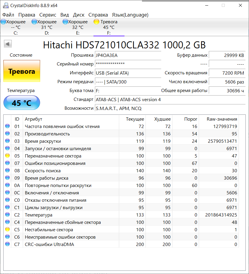 что то мало поработал.. у меня Hitachi HDS721010CLA332 1ТБ только после 30000 часов начал сыпать переназначенными, но по сих пор работает, ка хранилище не особо важных файлов, аудио/видео, всякий шмурдяк на нем..