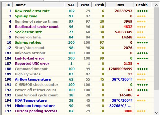 Привет. В последние полгода появилась проблема с хардом. Такое чувство, что он зависает на секунду-две, а потом начинает быстро раскручиваться, и при этом раздается сильный шум. Недавно сменил почти всю платформу, поэтому все шлейфы SATA/питание новые. Вот S.M.A.R.T: