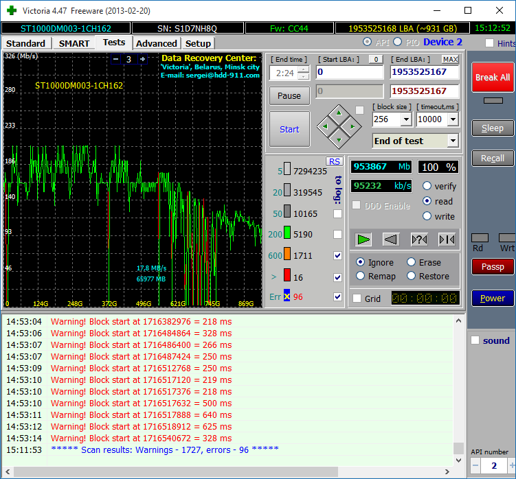 Запускайте тест виктории с ремапом, нажмите в том же окне надпись Remap. Похоже у вас софт бэда от плохого SATA проводе, замените его перед сканом с ремапом викторией.